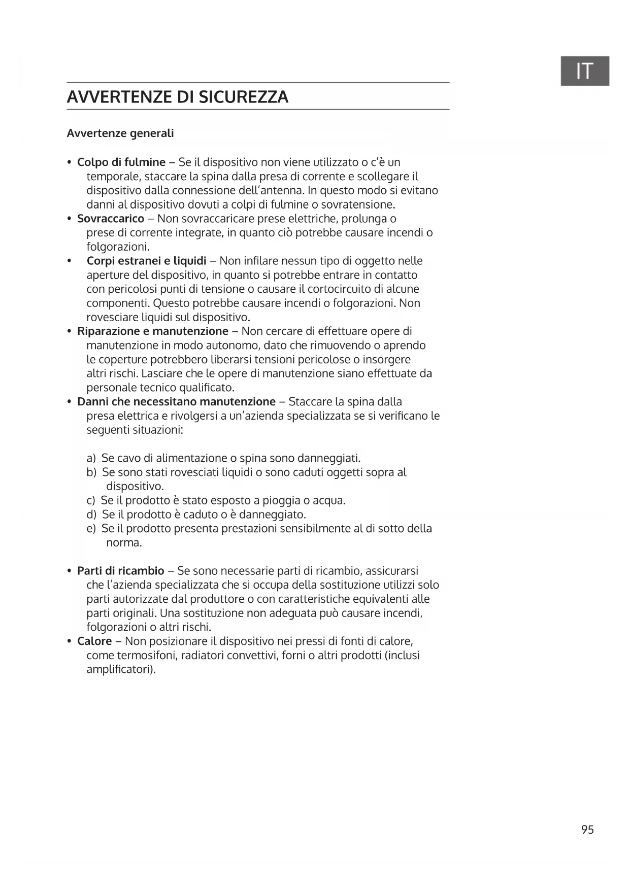 - Colpo di fulmine – Se il dispositivo non viene utilizzato o c’è un temporale, staccare la spina dalla presa di corrente e scollegare il dispositivo dalla connessione dell’antenna. In questo modo si evitano danni al dispositivo dovuti a colpi di fulmine o sovratensione.