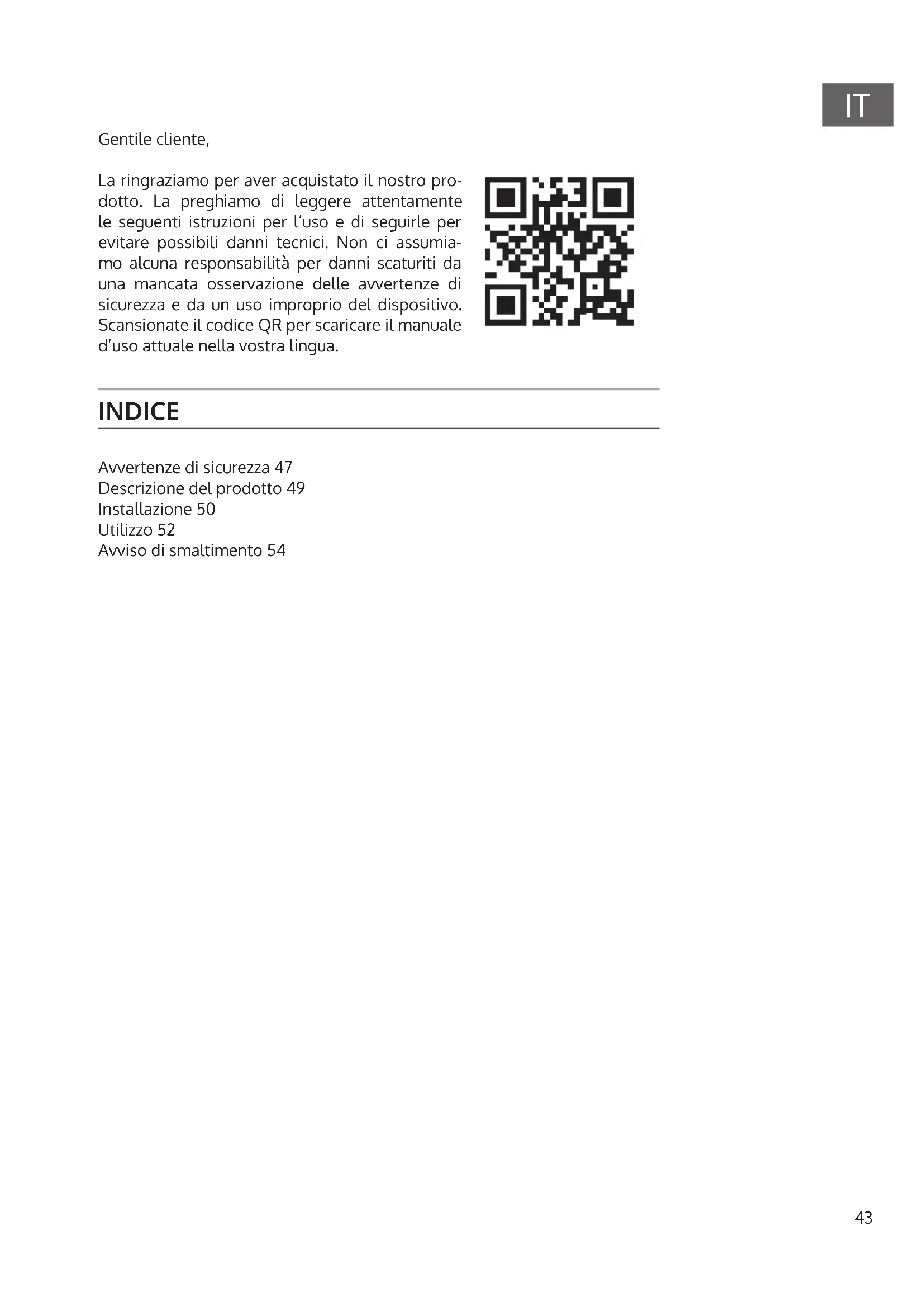 INDICE Avvertenze di sicurezza 47 Descrizione del prodotto 49 Installazione 50 Utilizzo 52 Avviso di smaltimento 54 Gentile cliente, La ringraziamo per aver acquistato il nostro pro- dotto. La preghiamo di leggere attentamente le seguenti istruzioni per l’uso e di seguirle per evitare possibili danni tecnici. Non ci assumia- mo alcuna responsabilità per danni scaturiti da una mancata osservazione delle avvertenze di sicurezza e da un uso improprio del dispositivo. Scansionate il codice QR per scaricare il manuale d’uso attuale nella vostra lingua.44