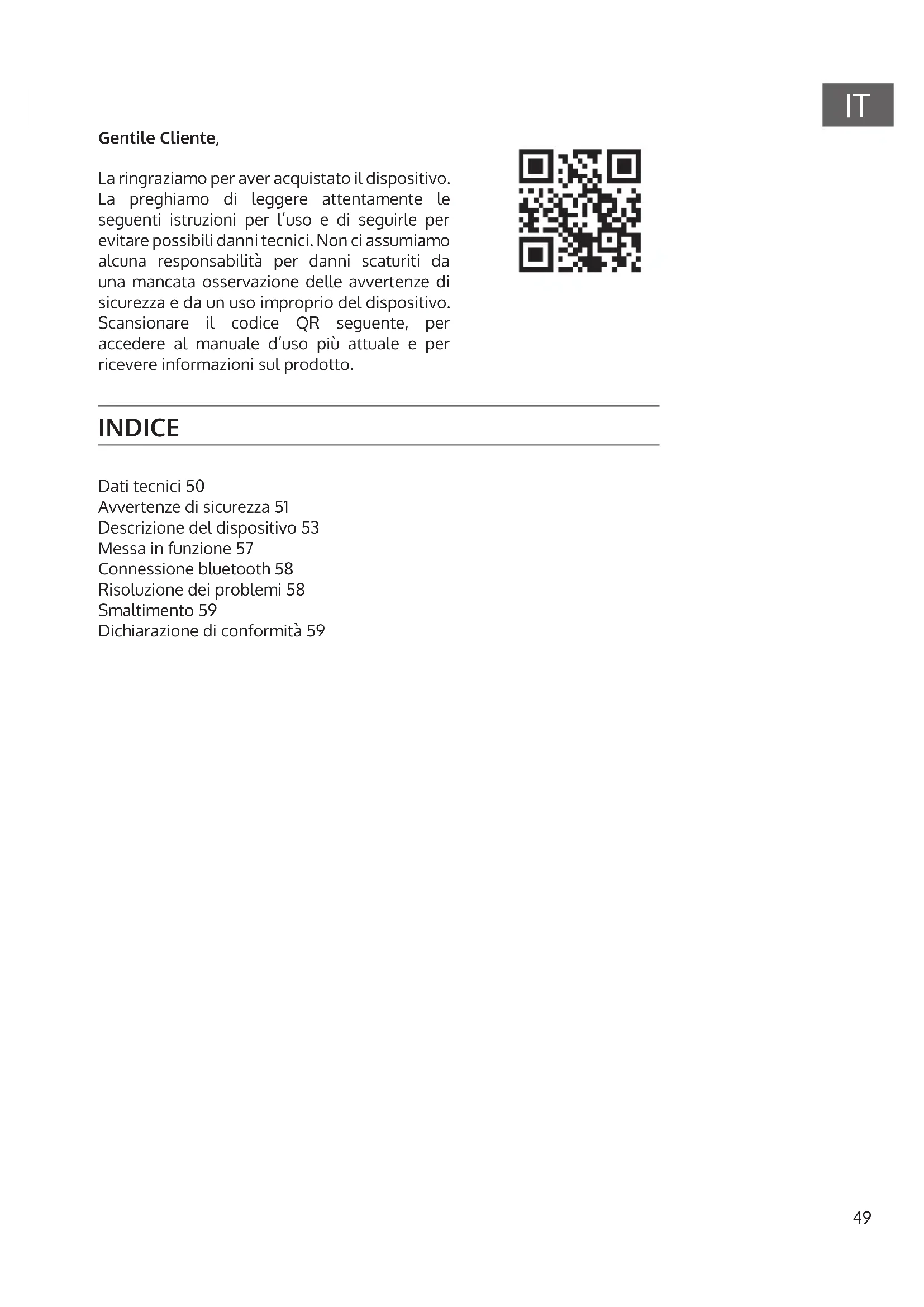 Dati tecnici 50 Avvertenze di sicurezza 51 Descrizione del dispositivo 53 Messa in funzione 57 Connessione bluetooth 58 Risoluzione dei problemi 58 Smaltimento 59 Dichiarazione di conformità 59 INDICE Gentile Cliente, La ringraziamo per aver acquistato il dispositivo. La preghiamo di leggere attentamente le seguenti istruzioni per l’uso e di seguirle per evitare possibili danni tecnici. Non ci assumiamo alcuna responsabilità per danni scaturiti da una mancata osservazione delle avvertenze di sicurezza e da un uso improprio del dispositivo. Scansionare il codice QR seguente, per accedere al manuale d’uso più attuale e per ricevere informazioni sul prodotto.50