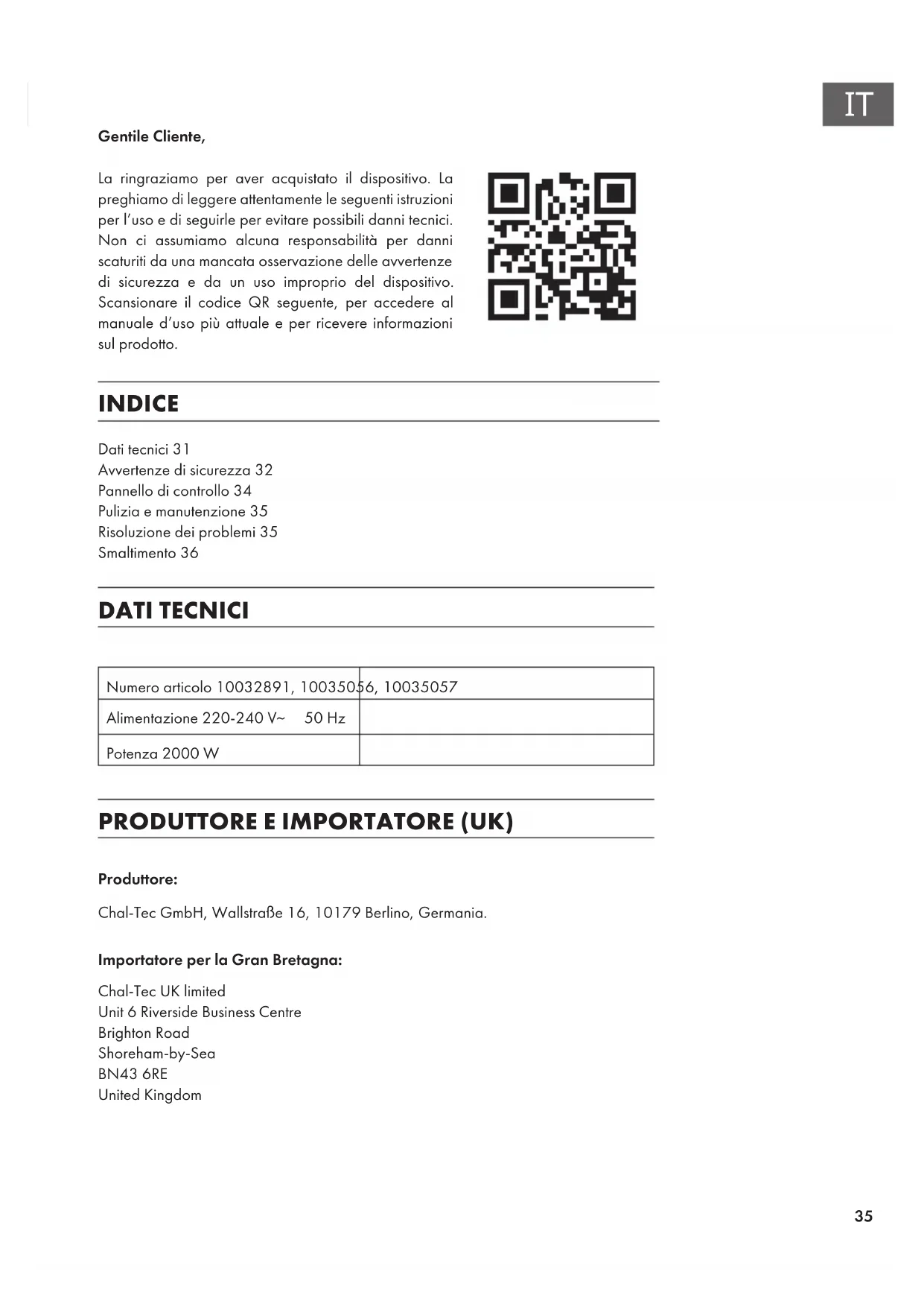 Dati tecnici 31 Avvertenze di sicurezza 32 Pannello di controllo 34 Pulizia e manutenzione 35 Risoluzione dei problemi 35 Smaltimento 36 DATI TECNICI Numero articolo 10032891, 10035056, 10035057 Alimentazione 220-240 V~ 50 Hz Potenza 2000 W PRODUTTORE E IMPORTATORE (UK) Produttore: Chal-Tec GmbH, Wallstraße 16, 10179 Berlino, Germania. Importatore per la Gran Bretagna: Chal-Tec UK limited Unit 6 Riverside Business Centre Brighton Road Shoreham-by-Sea BN43 6RE United Kingdom Gentile Cliente, La ringraziamo per aver acquistato il dispositivo. La preghiamo di leggere attentamente le seguenti istruzioni per l’uso e di seguirle per evitare possibili danni tecnici. Non ci assumiamo alcuna responsabilità per danni scaturiti da una mancata osservazione delle avvertenze di sicurezza e da un uso improprio del dispositivo. Scansionare il codice QR seguente, per accedere al manuale d’uso più attuale e per ricevere informazioni sul prodotto. INDICE36
