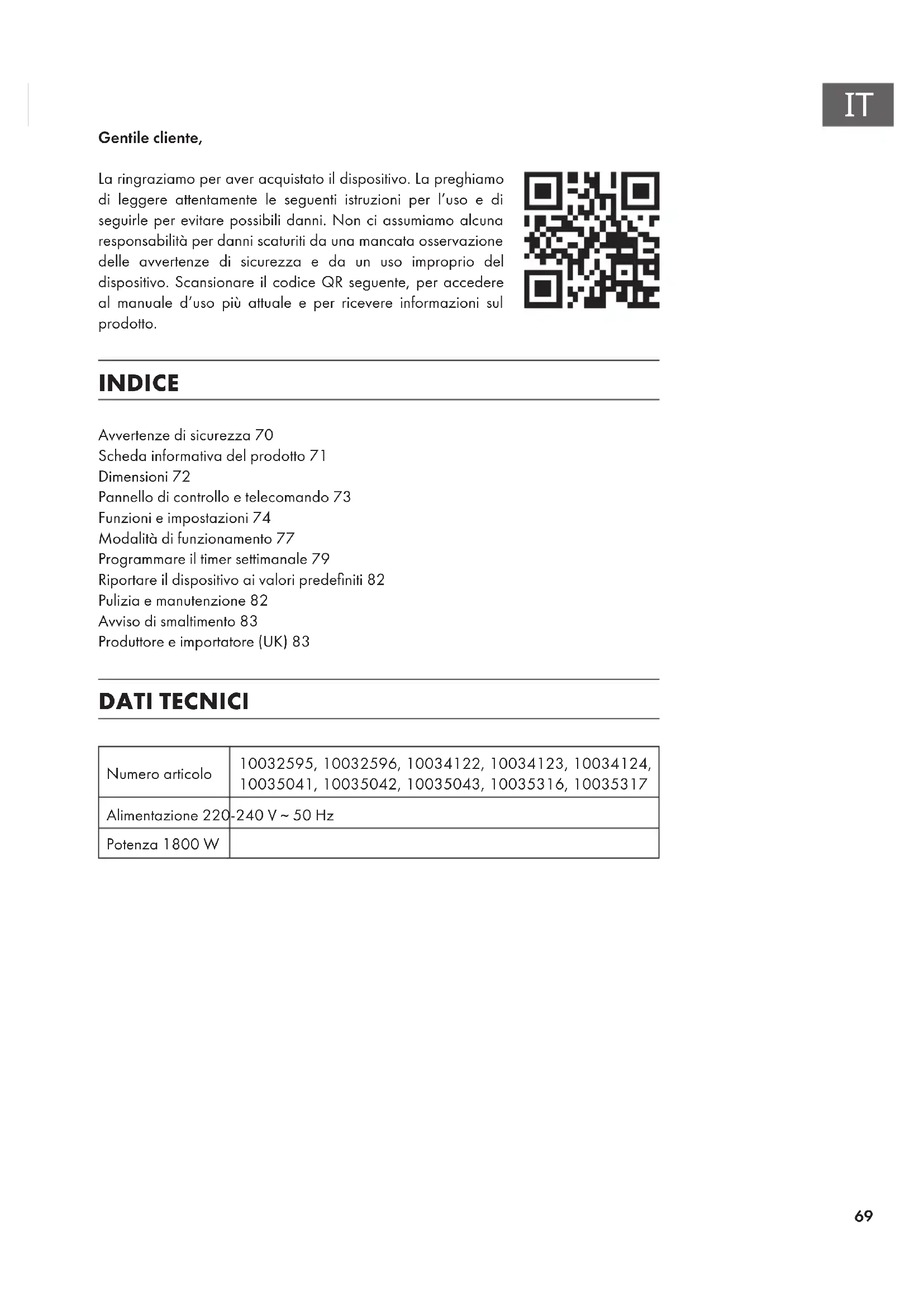 Gentile cliente, La ringraziamo per aver acquistato il dispositivo. La preghiamo di leggere attentamente le seguenti istruzioni per l’uso e di seguirle per evitare possibili danni. Non ci assumiamo alcuna responsabilità per danni scaturiti da una mancata osservazione delle avvertenze di sicurezza e da un uso improprio del dispositivo. Scansionare il codice QR seguente, per accedere al manuale d’uso più attuale e per ricevere informazioni sul prodotto. INDICE Avvertenze di sicurezza70 Scheda informativa del prodotto71 Dimensioni72 Pannello di controllo e telecomando73 Funzioni e impostazioni74 Modalità di funzionamento77 Programmare il timer settimanale79 Riportare il dispositivo ai valori predeniti82 Pulizia e manutenzione82 Avviso di smaltimento83 Produttore e importatore (UK)83 DATI TECNICI Numero articolo 10032595, 10032596, 10034122, 10034123, 10034124, 10035041, 10035042, 10035043, 10035316, 10035317 Alimentazione 220-240 V ~ 50 Hz Potenza 1800 W70