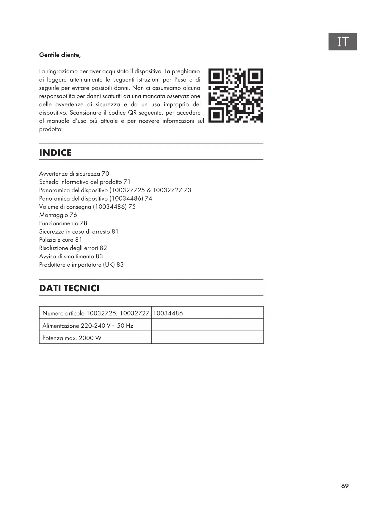 Gentile cliente, La ringraziamo per aver acquistato il dispositivo. La preghiamo di leggere attentamente le seguenti istruzioni per l’uso e di seguirle per evitare possibili danni. Non ci assumiamo alcuna responsabilità per danni scaturiti da una mancata osservazione delle avvertenze di sicurezza e da un uso improprio del dispositivo. Scansionare il codice QR seguente, per accedere al manuale d’uso più attuale e per ricevere informazioni sul prodotto: INDICE Avvertenze di sicurezza70 Scheda informativa del prodotto71 Panoramica del dispositivo (100327725 & 1003272773 Panoramica del dispositivo (10034486)74 Volume di consegna (10034486)75 Montaggio76 Funzionamento78 Sicurezza in caso di arresto81 Pulizia e cura81 Risoluzione degli errori82 Avviso di smaltimento83 Produttore e importatore (UK)83 DATI TECNICI Numero articolo 10032725, 10032727, 10034486 Alimentazione 220-240 V ~ 50 Hz Potenza max. 2000 W70