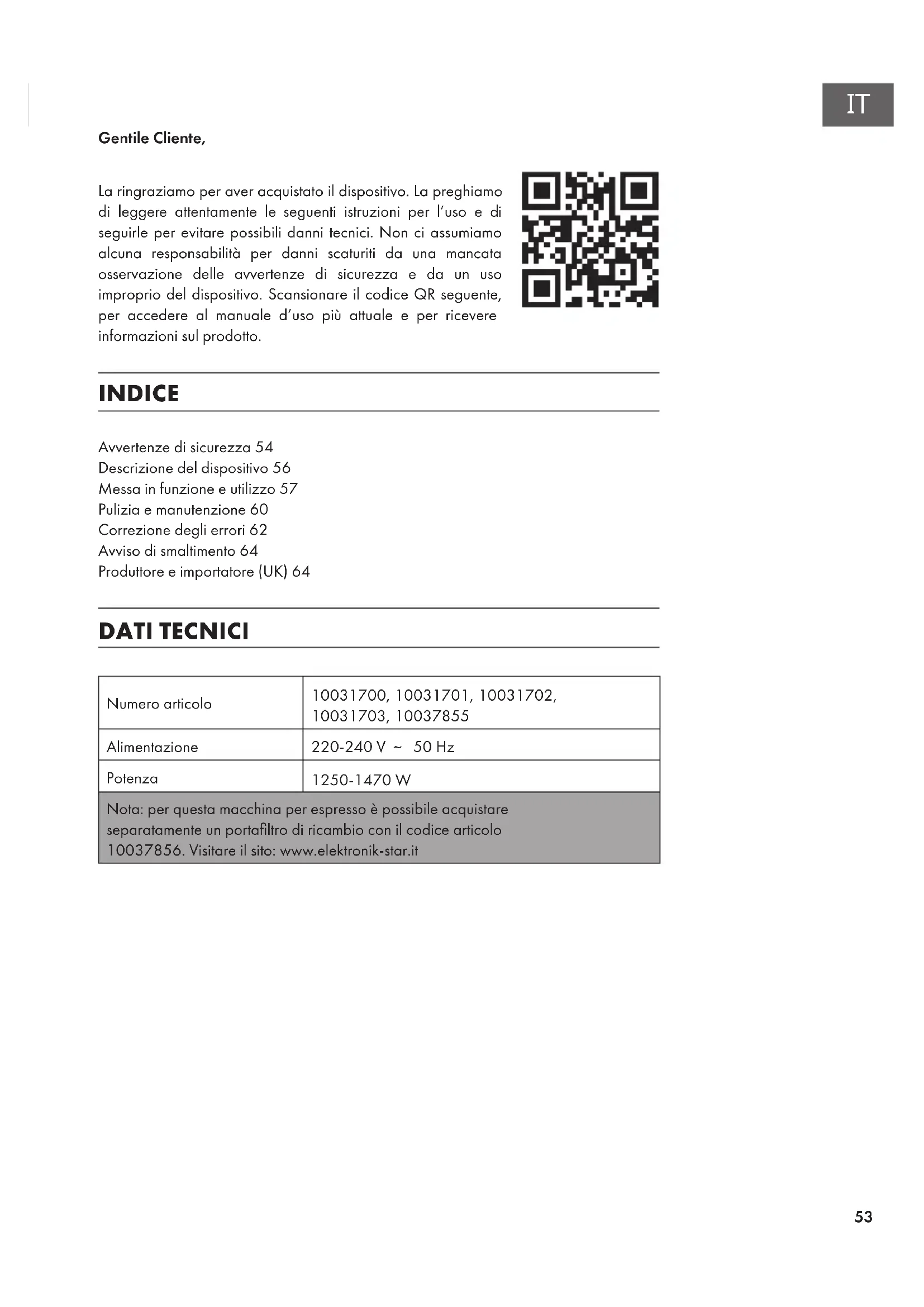 Gentile Cliente, La ringraziamo per aver acquistato il dispositivo. La preghiamo di leggere attentamente le seguenti istruzioni per l’uso e di seguirle per evitare possibili danni tecnici. Non ci assumiamo alcuna responsabilità per danni scaturiti da una mancata osservazione delle avvertenze di sicurezza e da un uso improprio del dispositivo. Scansionare il codice QR seguente, per accedere al manuale d’uso più attuale e per ricevere informazioni sul prodotto. INDICE Avvertenze di sicurezza 54 Descrizione del dispositivo 56 Messa in funzione e utilizzo 57 Pulizia e manutenzione 60 Correzione degli errori 62 Avviso di smaltimento 64 Produttore e importatore (UK) 64 DATI TECNICI Numero articolo 10031700, 10031701, 10031702, 10031703, 10037855 Alimentazione 220-240 V ~ 50 Hz Potenza 1250-1470 W Nota: per questa macchina per espresso è possibile acquistare separatamente un portaltro di ricambio con il codice articolo 10037856. Visitare il sito: www.elektronik-star.it54