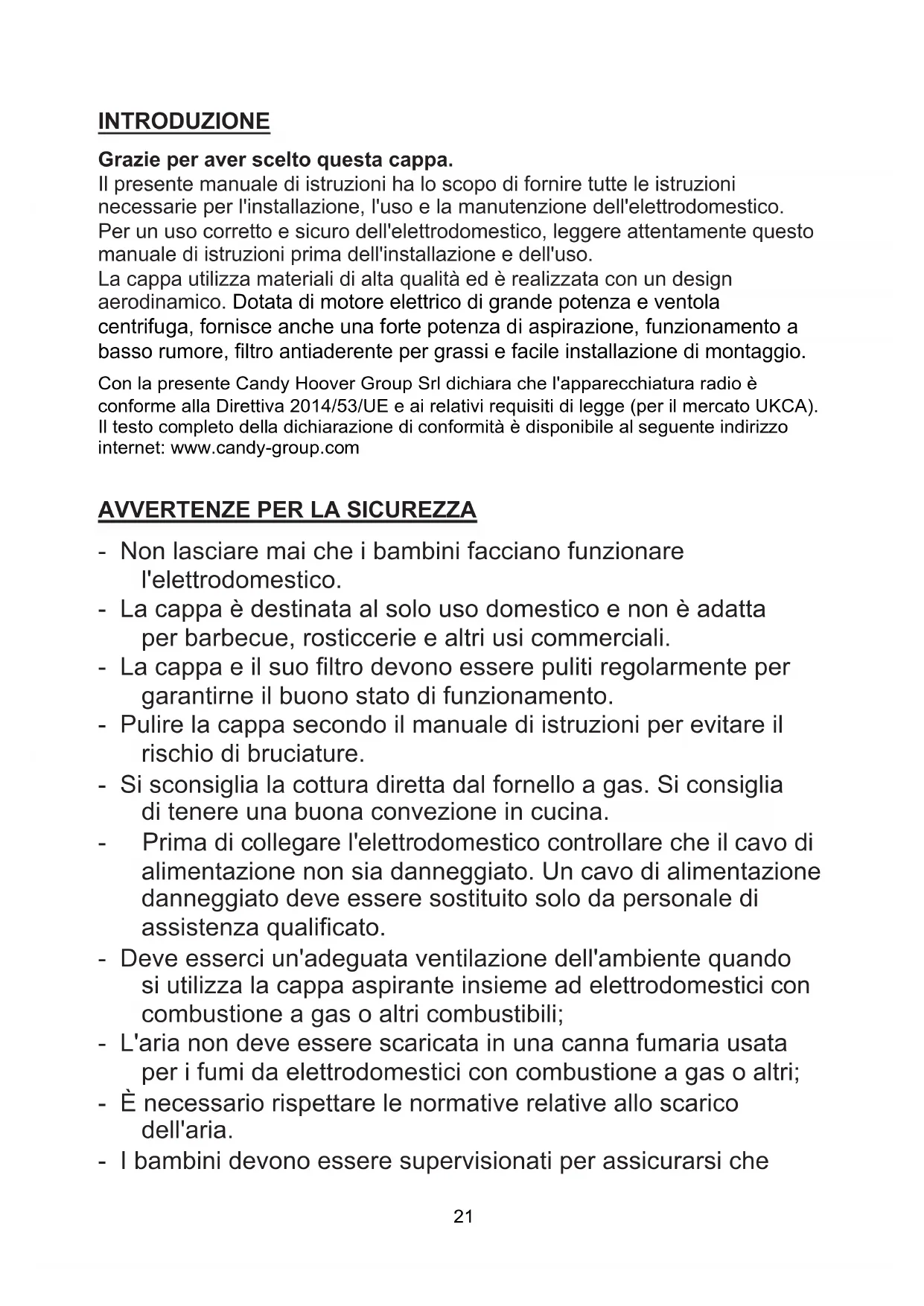INTRODUZIONE Grazie per aver scelto questa cappa. Il presente manuale di istruzioni ha lo scopo di fornire tutte le istruzioni necessarie per l'installazione, l'uso e la manutenzione dell'elettrodomestico. Per un uso corretto e sicuro dell'elettrodomestico, leggere attentamente questo manuale di istruzioni prima dell'installazione e dell'uso. La cappa utilizza materiali di alta qualità ed è realizzata con un design aerodinamico. Dotata di motore elettrico di grande potenza e ventola centrifuga, fornisce anche una forte potenza di aspirazione, funzionamento a basso rumore, filtro antiaderente per grassi e facile installazione di montaggio. Con la presente Candy Hoover Group Srl dichiara che l'apparecchiatura radio è conforme alla Direttiva 2014/53/UE e ai relativi requisiti di legge (per il mercato UKCA). Il testo completo della dichiarazione di conformità è disponibile al seguente indirizzo internet: www.candy-group.com