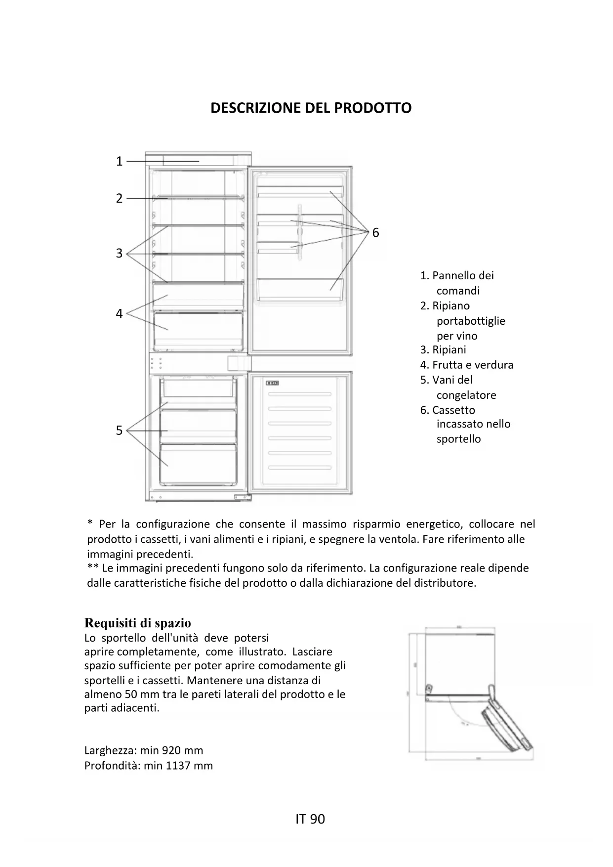 - Per la configurazione che consente il massimo risparmio energetico, collocare nel prodotto i cassetti, i vani alimenti e i ripiani, e spegnere la ventola. Fare riferimento alleimmagini precedenti.** Le immagini precedenti fungono solo da riferimento. La configurazione reale dipendedalle caratteristiche fisiche del prodotto o dalla dichiarazione del distributore. Requisiti di spazio Lo sportello dell'unità deve potersi aprire completamente, come illustrato. Lasciare spazio sufficiente per poter aprire comodamente gli sportelli e i cassetti. Mantenere una distanza di almeno 50 mm tra le pareti laterali del prodotto e le parti adiacenti.Larghezza: min 920 mmProfondità: min 1137 mm1. Pannello deicomandi2. Ripianoportabottiglieper vino3. Ripiani4. Frutta e verdura5. Vani delcongelatore6. Cassettoincassato nellosportello