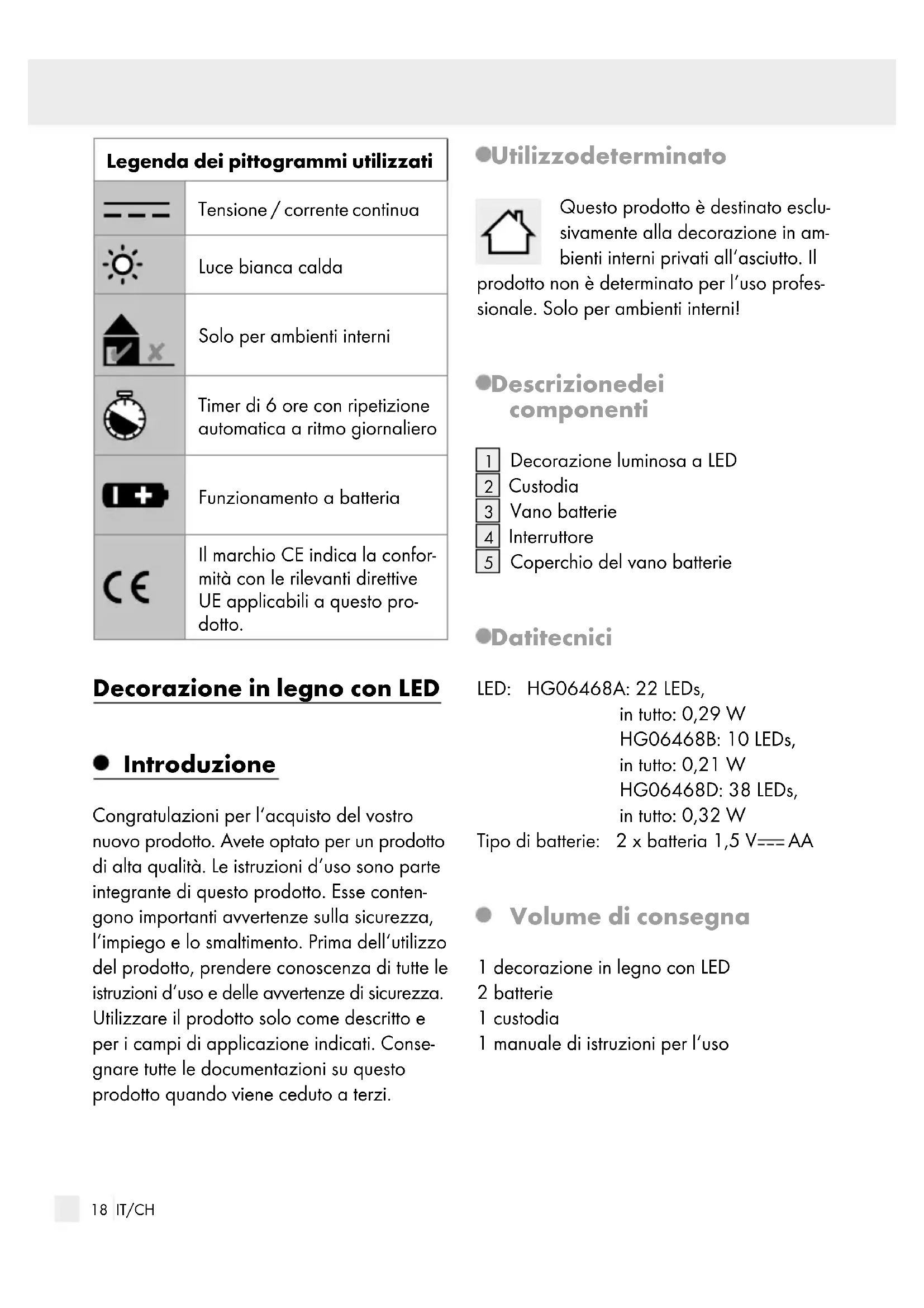 Volume di consegna 1 decorazione in legno con LED 2 batterie 1 custodia 1 manuale di istruzioni per l‘uso19 IT/CH Avvertenze di sicurezza