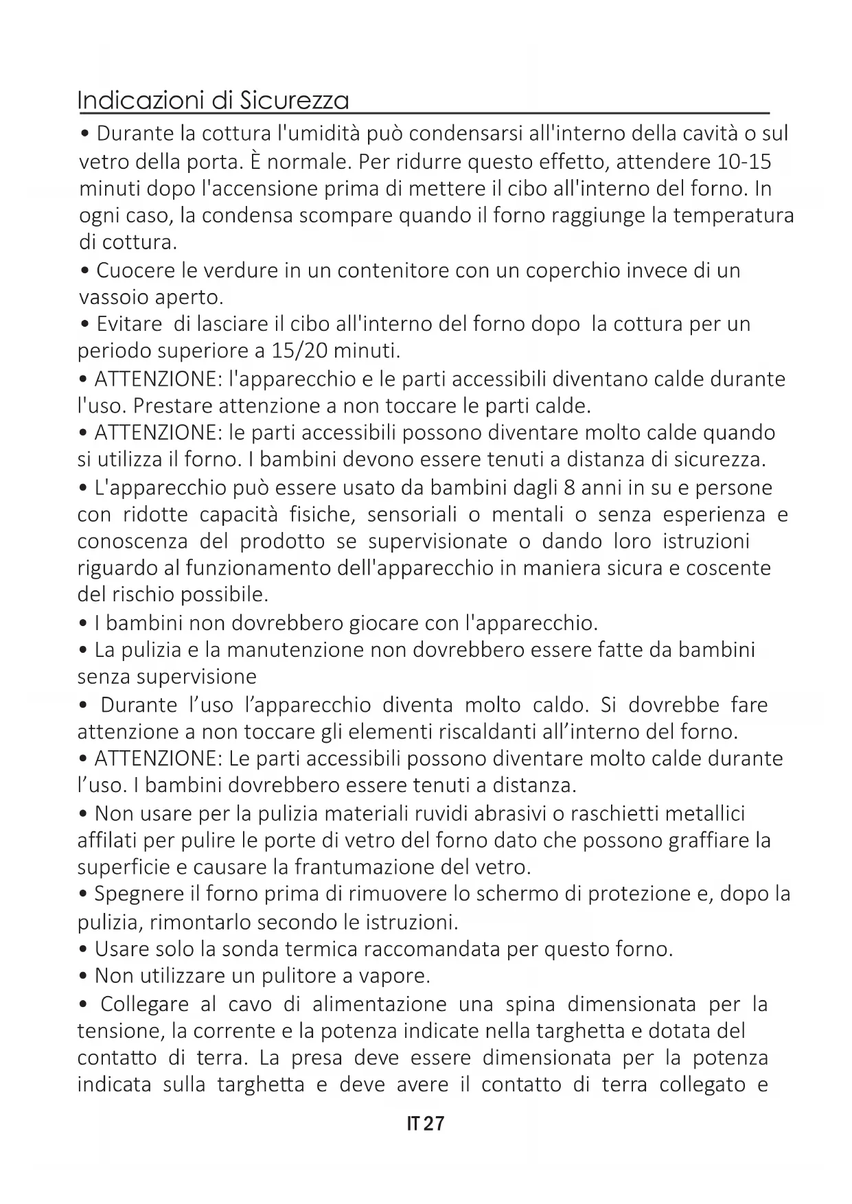Utilizzare il forno solo per lo scopo per cui è stato progettato, ossia solo per la cottura di alimenti; qualsiasi altro utilizzo, ad esempio come fonte di riscaldamento, è considerato improprio e quindi pericoloso. Il costruttore non può essere considerato responsabile per eventuali danni derivanti da usi impropri, erronei ed irragionevoli. L’uso di un qualsiasi apparecchio elettrico comporta l’osservanza di alcune regole fondamentali: - Non tirare il cavo di alimentazione per staccare la spina della presa di corrente; - Non toccare l’apparecchio con mani o piedi bagnati o umidi; - In generale è sconsigliabile l’uso di adattatori, prese multiple e prolunghe; - In caso di guasto e/o cattivo funzionamento dell’apparecchio, spegnerlo e non manometterlo.