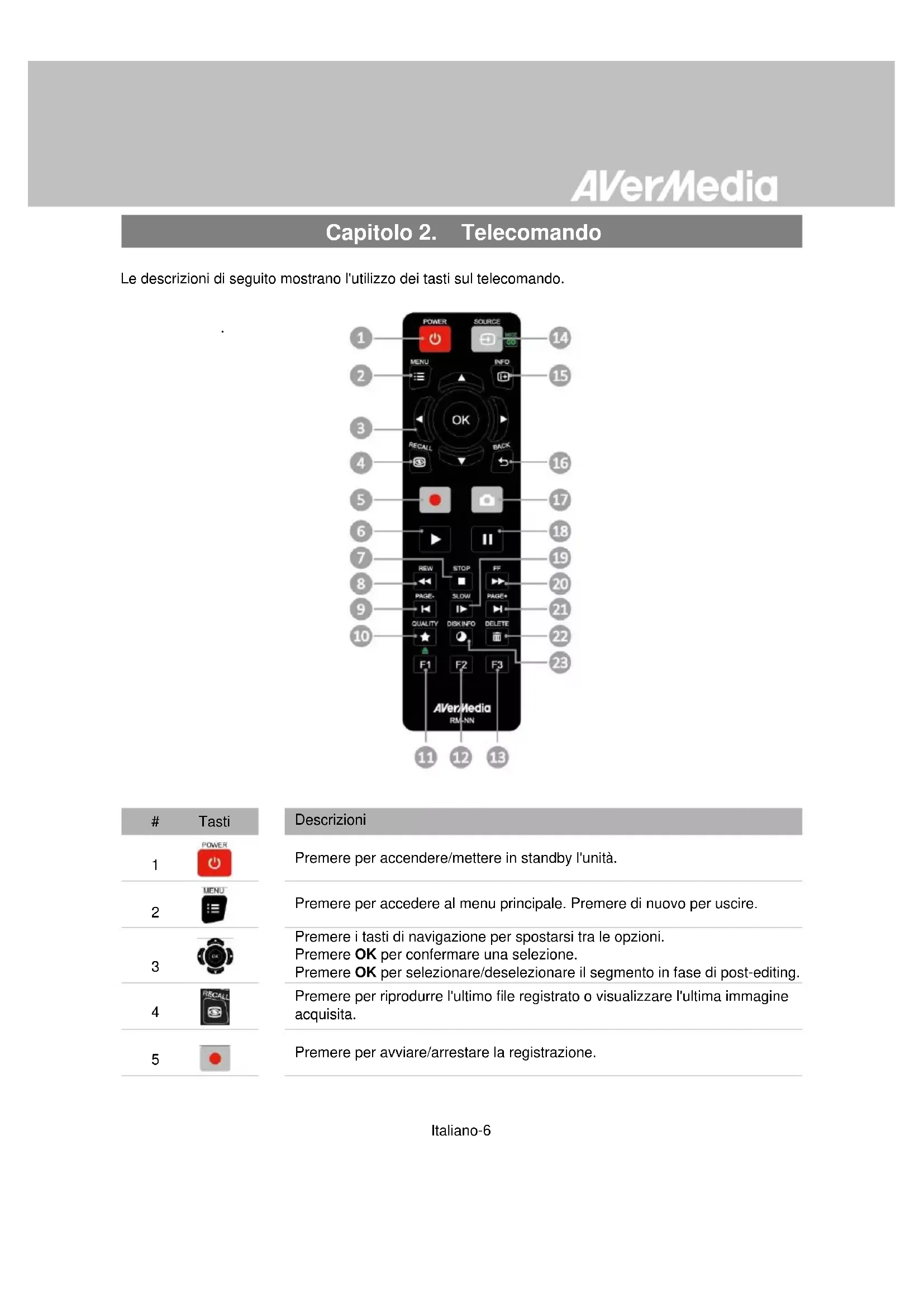 Verde fissoItaliano-6 Capitolo 2. Telecomando Le descrizioni di seguito mostrano l'utilizzo dei tasti sul telecomando.