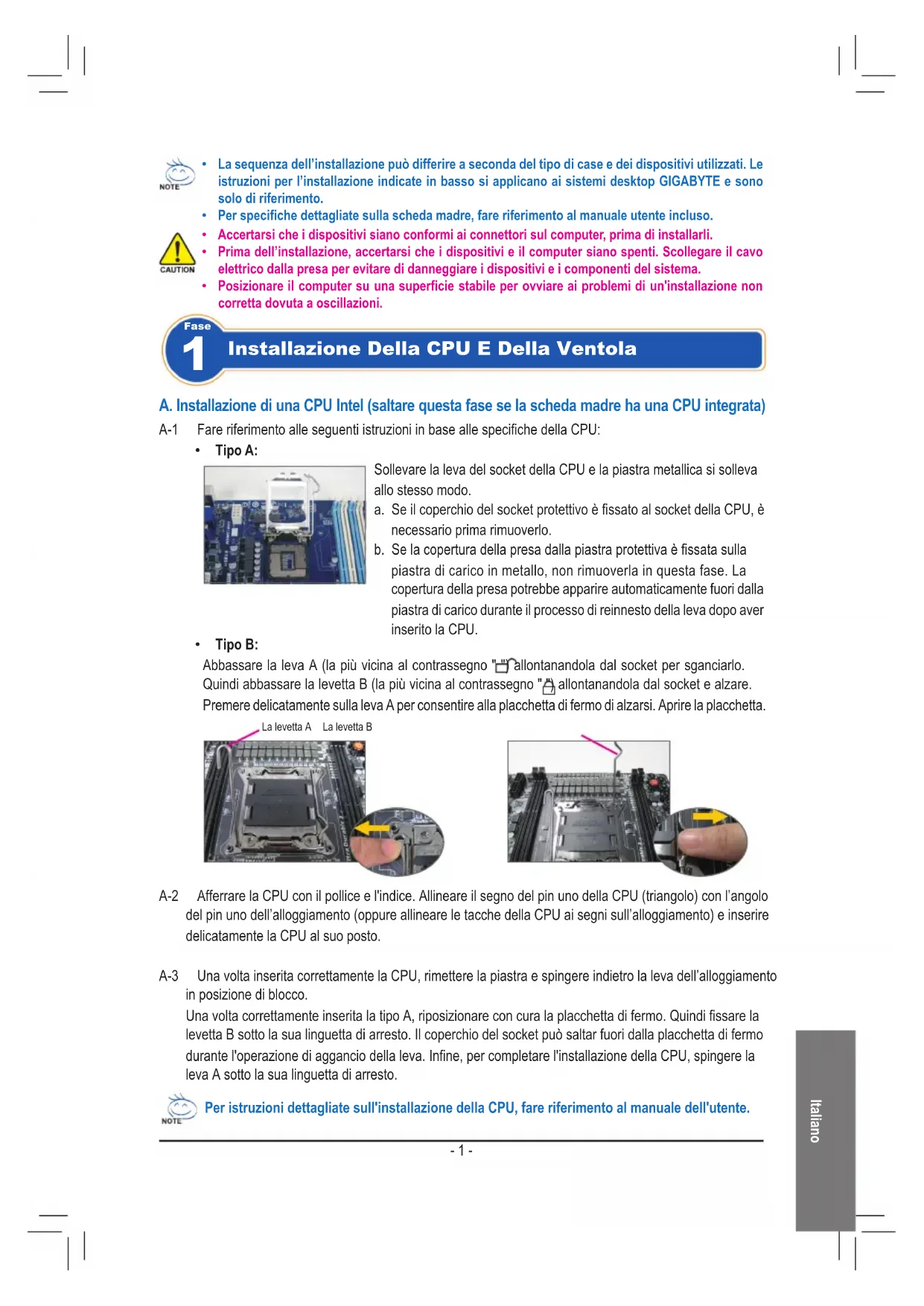 - Tipo B: Abbassare la leva A (la più vicina al contrassegno " ") allontanandola dal socket per sganciarlo. Quindi abbassare la levetta B (la più vicina al contrassegno " ") allontanandola dal socket e alzare. Premere delicatamente sulla leva A per consentire alla placchetta di fermo di alzarsi. Aprire la placchetta. A-1 FareriferimentoalleseguentiistruzioniinbaseallespecichedellaCPU: