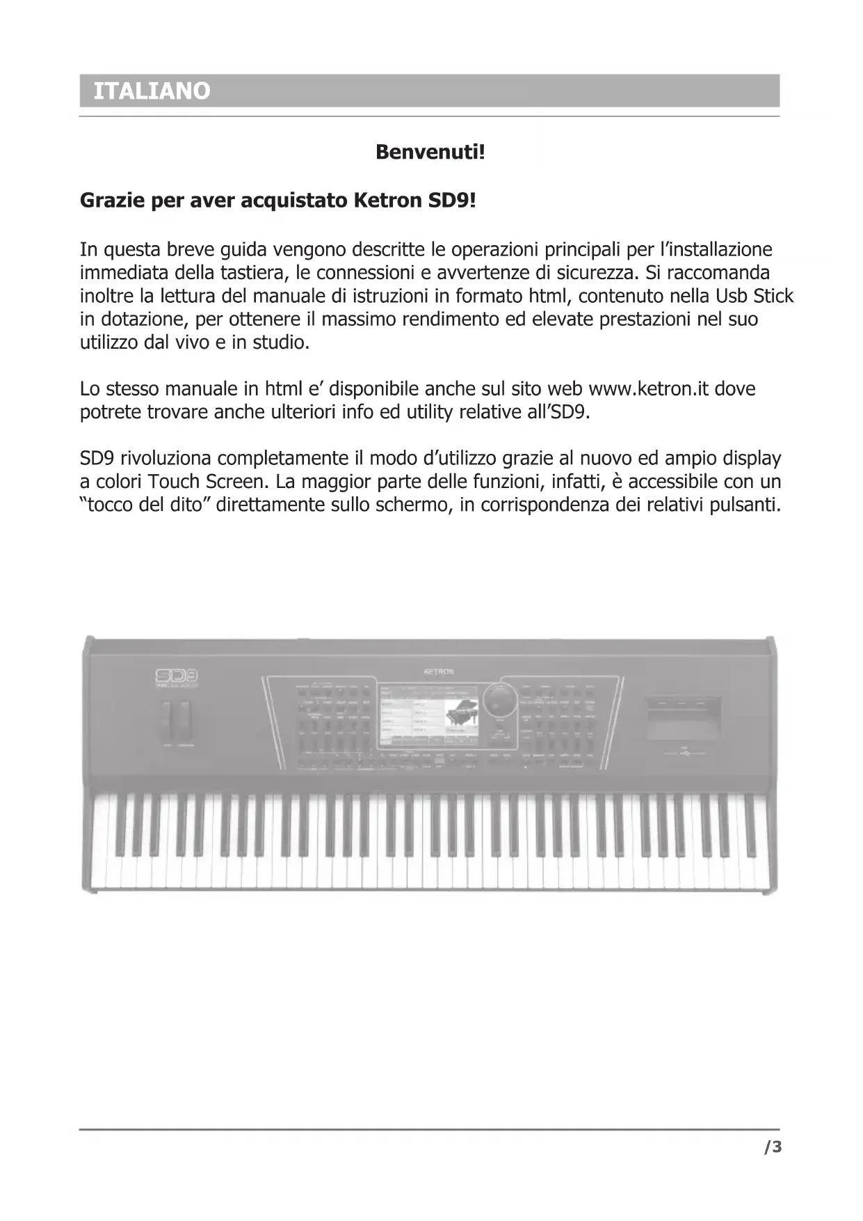 27/3 ITALIANO Benvenuti! Grazie per aver acquistato Ketron SD9! In questa breve guida vengono descritte le operazioni principali per l’installazione immediata della tastiera, le connessioni e avvertenze di sicurezza. Si raccomanda inoltre la lettura del manuale di istruzioni in formato html, contenuto nella Usb Stick in dotazione, per ottenere il massimo rendimento ed elevate prestazioni nel suo utilizzo dal vivo e in studio. Lo stesso manuale in html e’ disponibile anche sul sito web www.ketron.it dove potrete trovare anche ulteriori info ed utility relative all’SD9. SD9 rivoluziona completamente il modo d’utilizzo grazie al nuovo ed ampio display a colori Touch Screen. La maggior parte delle funzioni, infatti, è accessibile con un “tocco del dito” direttamente sullo schermo, in corrispondenza dei relativi pulsanti./4 ISTRUZIONI RIGUARDANTI IL RISCHIO DI INCENDIO, SCOSSE ELETTRICHE O DANNO ALLE PERSONE. AVVERTENZA: per ridurre il rischio di incendio o scosse elettriche, non esporre lo strumento alla pioggia o umidità. ISTRUZIONI IMPORTANTI PER LA SICUREZZA E L’INSTALLAZIONE AVVERTENZA: usando prodotti elettrici, dovete seguire alcune precauzioni di base tra cui le seguenti: