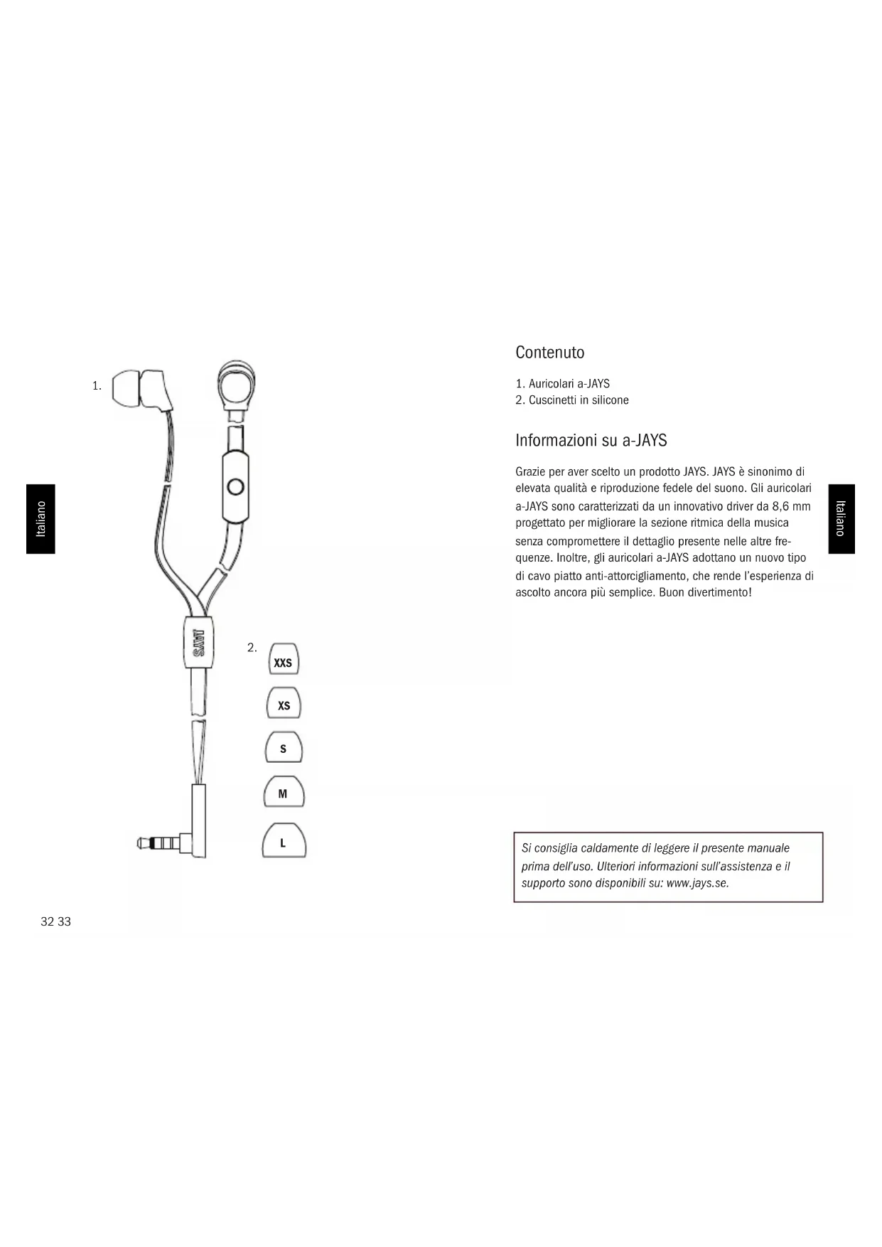 Informazioni su a-JAYS Grazie per aver scelto un prodotto JAYS. JAYS è sinonimo di elevata qualità e riproduzione fedele del suono. Gli auricolari a-JAYS sono caratterizzati da un innovativo driver da 8,6 mm progettato per migliorare la sezione ritmica della musica senza compromettere il dettaglio presente nelle altre fre- quenze. Inoltre, gli auricolari a-JAYS adottano un nuovo tipo di cavo piatto anti-attorcigliamento, che rende l’esperienza di ascolto ancora più semplice. Buon divertimento! Si consiglia caldamente di leggere il presente manuale prima dell’uso. Ulteriori informazioni sull’assistenza e il supporto sono disponibili su: www.jays.se. XXS