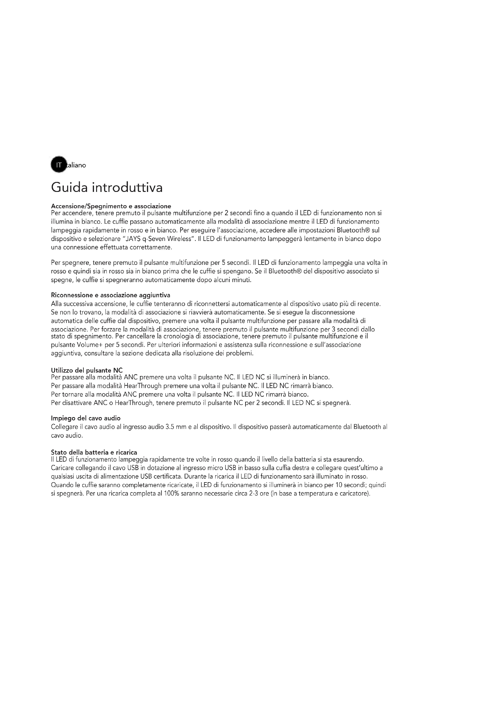 - Modificaciones o reparaciones efectuadas por usted mismo o terceros sin la aprobación de Northbaze Group AB. Forma de obtención de la reparación de la garantía Si desea realizar una reclamación de la garantía dentro del periodo limitado de la garantía, póngase en contacto con el distribuidor de su producto para obtener más ayuda. Deberá aportar el comprobante de compra y la parte afectada. Cualquier parte defectuosa cubierta por la garantía limitada se reparará o sustituirá sin coste alguno. Las partes sustituidas o reparadas proporcionadas durante el periodo de la garantía tendrán garantía durante el resto del periodo de la garantía original o durante sesenta (60) días a partir de la fecha de la reparación o sustitución, el periodo que sea mayor. Si desea conocer las preguntas frecuentes, visite www.jaysheadphones.com.IT Italiano Guida introduttiva Accensione/Spegnimento e associazione Per accendere, tenere premuto il pulsante multifunzione per 2 secondi fino a quando il LED di funzionamento non si illumina in bianco. Le cuffie passano automaticamente alla modalità di associazione mentre il LED di funzionamento lampeggia rapidamente in rosso e in bianco. Per eseguire l’associazione, accedere alle impostazioni Bluetooth® sul dispositivo e selezionare “JAYS q-Seven Wireless”. Il LED di funzionamento lampeggerà lentamente in bianco dopo una connessione effettuata correttamente. Per spegnere, tenere premuto il pulsante multifunzione per 5 secondi. Il LED di funzionamento lampeggia una volta in rosso e quindi sia in rosso sia in bianco prima che le cuffie si spengano. Se il Bluetooth® del dispositivo associato si spegne, le cuffie si spegneranno automaticamente dopo alcuni minuti. Riconnessione e associazione aggiuntiva Alla successiva accensione, le cuffie tenteranno di riconnettersi automaticamente al dispositivo usato più di recente. Se non lo trovano, la modalità di associazione si riavvierà automaticamente. Se si esegue la disconnessione automatica delle cuffie dal dispositivo, premere una volta il pulsante multifunzione per passare alla modalità di associazione. Per forzare la modalità di associazione, tenere premuto il pulsante multifunzione per 3 secondi dallo stato di spegnimento. Per cancellare la cronologia di associazione, tenere premuto il pulsante multifunzione e il pulsante Volume+ per 5 secondi. Per ulteriori informazioni e assistenza sulla riconnessione e sull’associazione aggiuntiva, consultare la sezione dedicata alla risoluzione dei problemi. Utilizzo del pulsante NC Per passare alla modalità ANC premere una volta il pulsante NC. Il LED NC si illuminerà in bianco. Per passare alla modalità HearThrough premere una volta il pulsante NC. Il LED NC rimarrà bianco. Per tornare alla modalità ANC premere una volta il pulsante NC. Il LED NC rimarrà bianco. Per disattivare ANC o HearThrough, tenere premuto il pulsante NC per 2 secondi. Il LED NC si spegnerà. Impiego del cavo audio Collegare il cavo audio al ingresso audio 3.5 mm e al dispositivo. Il dispositivo passerà automaticamente dal Bluetooth al cavo audio. Stato della batteria e ricarica Il LED di funzionamento lampeggia rapidamente tre volte in rosso quando il livello della batteria si sta esaurendo. Caricare collegando il cavo USB in dotazione al ingresso micro USB in basso sulla cuffia destra e collegare quest’ultimo a qualsiasi uscita di alimentazione USB certificata. Durante la ricarica il LED di funzionamento sarà illuminato in rosso. Quando le cuffie saranno completamente ricaricate, il LED di funzionamento si illuminerà in bianco per 10 secondi; quindi si spegnerà. Per una ricarica completa al 100% saranno necessarie circa 2-3 ore (in base a temperatura e caricatore).Funzioni dei pulsanti e gli indicatori LED Utilizzo del pulsante multifunzione Funzione Rispondi/Termina chiamata Ricomponi il numero dell’ultima persona che ha chiamato Rifiuta chiamata Controllo vocale Riproduci/Metti in pausa la musica Accendi Spegni Cancella registro associazioni Azione Premere una volta il pulsante multifunzione Premere tre volte il pulsante multifunzione Premere il pulsante multifunzione per 2 sec. Premere due volte il pulsante multifunzione Premere una volta il pulsante multifunzione Premere il pulsante multifunzione per 2 sec. Premere il pulsante multifunzione per 5 sec. Premere il pulsante multifunzione e volume+ per 5 sec. Indicatore LED di funzionamento Spiegazione Accese Spente Standby Batteria scarica In carica Ricarica completata LED di funzionamento Lampeggia in bianco Lampeggia in rosso/bianco Lampeggia in bianco Lampeggia in rosso Luce rossa fissa Lampeggia in bianco Spiegazione Modalità associazione Bluetooth® Connessione Bluetooth® effettuata correttamente Connessione Bluetooth® interrotta Cancella elenco Bluetooth® Chiamata in arrivo LED di funzionamento Lampeggia in rosso/bianco Lampeggia in bianco Lampeggia in rosso/bianco Lampeggia in bianco Lampeggia in bianco Indicatore LED di funzionamentoRizoluzione dei problemi Problema relativo all’associazione e alla connessione
