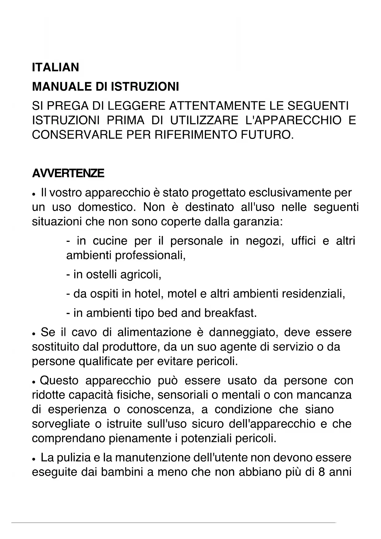 • La pulizia e la manutenzione dell'utente non devono essere eseguite dai bambini a meno che non abbiano più di 8 annie siano supervisionati.