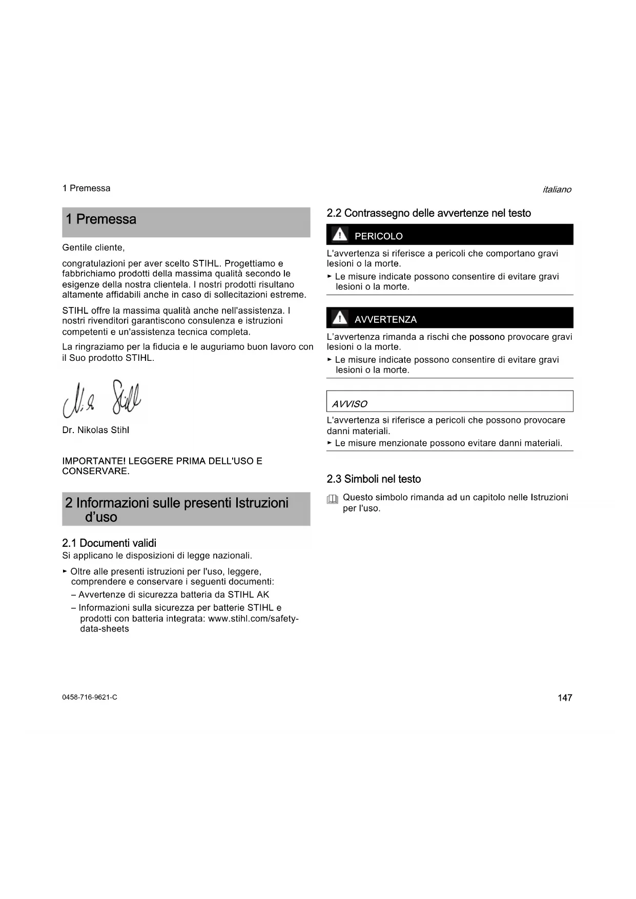 italiano 1 Premessa Gentile cliente, congratulazioni per aver scelto STIHL. Progettiamo e fabbrichiamo prodotti della massima qualità secondo le esigenze della nostra clientela. I nostri prodotti risultano altamente affidabili anche in caso di sollecitazioni estreme. STIHL offre la massima qualità anche nell'assistenza. I nostri rivenditori garantiscono consulenza e istruzioni competenti e un'assistenza tecnica completa. La ringraziamo per la fiducia e le auguriamo buon lavoro con il Suo prodotto STIHL. Dr. Nikolas Stihl
