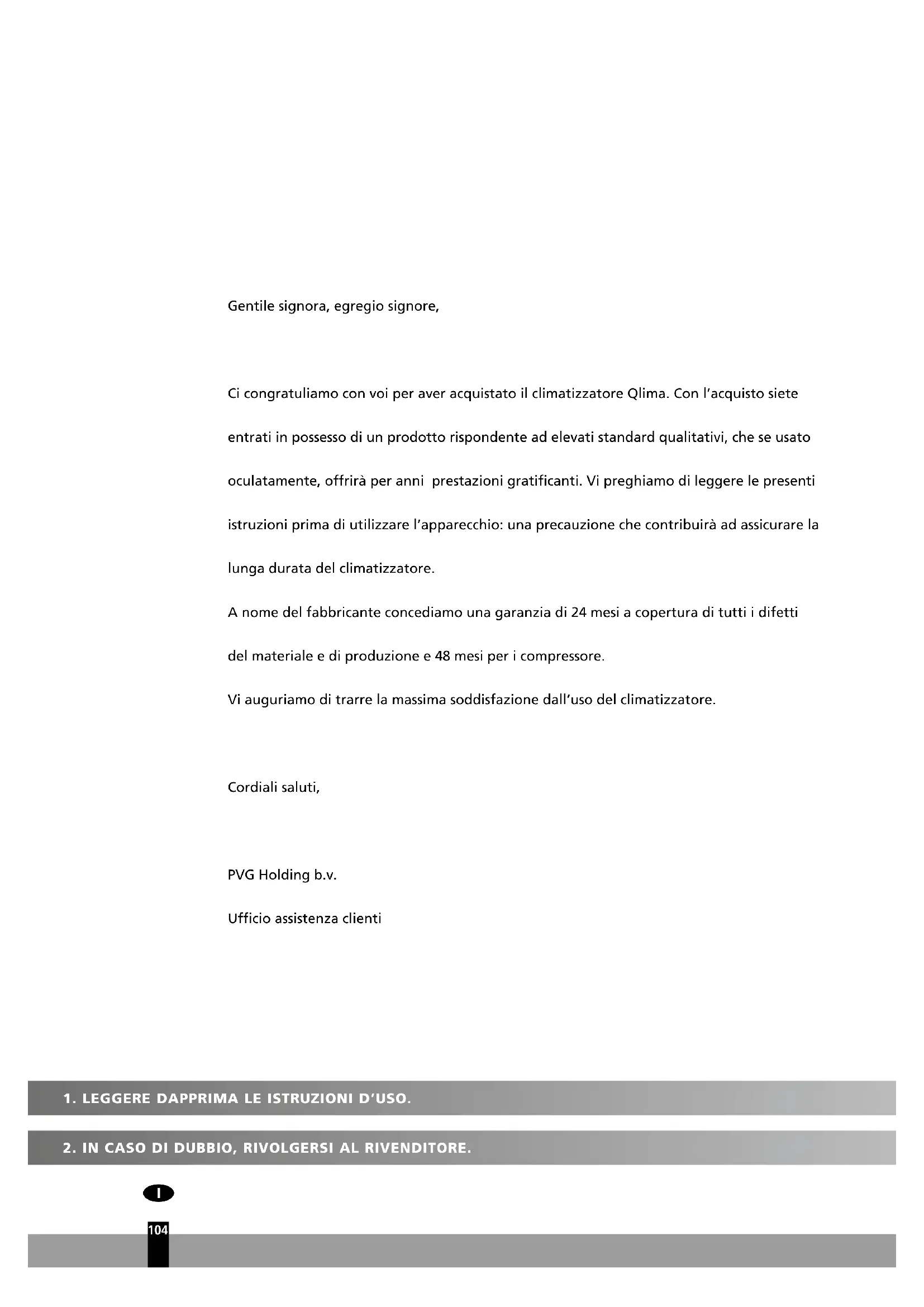 Gentile signora, egregio signore, Ci congratuliamo con voi per aver acquistato il climatizzatore Qlima. Con l’acquisto siete entrati in possesso di un prodotto rispondente ad elevati standard qualitativi, che se usato oculatamente, offrirà per anni prestazioni gratificanti. Vi preghiamo di leggere le presenti istruzioni prima di utilizzare l’apparecchio: una precauzione che contribuirà ad assicurare la lunga durata del climatizzatore. A nome del fabbricante concediamo una garanzia di 24 mesi a copertura di tutti i difetti del materiale e di produzione e 48 mesi per i compressore. Vi auguriamo di trarre la massima soddisfazione dall’uso del climatizzatore. Cordiali saluti, PVG Holding b.v. Ufficio assistenza clienti