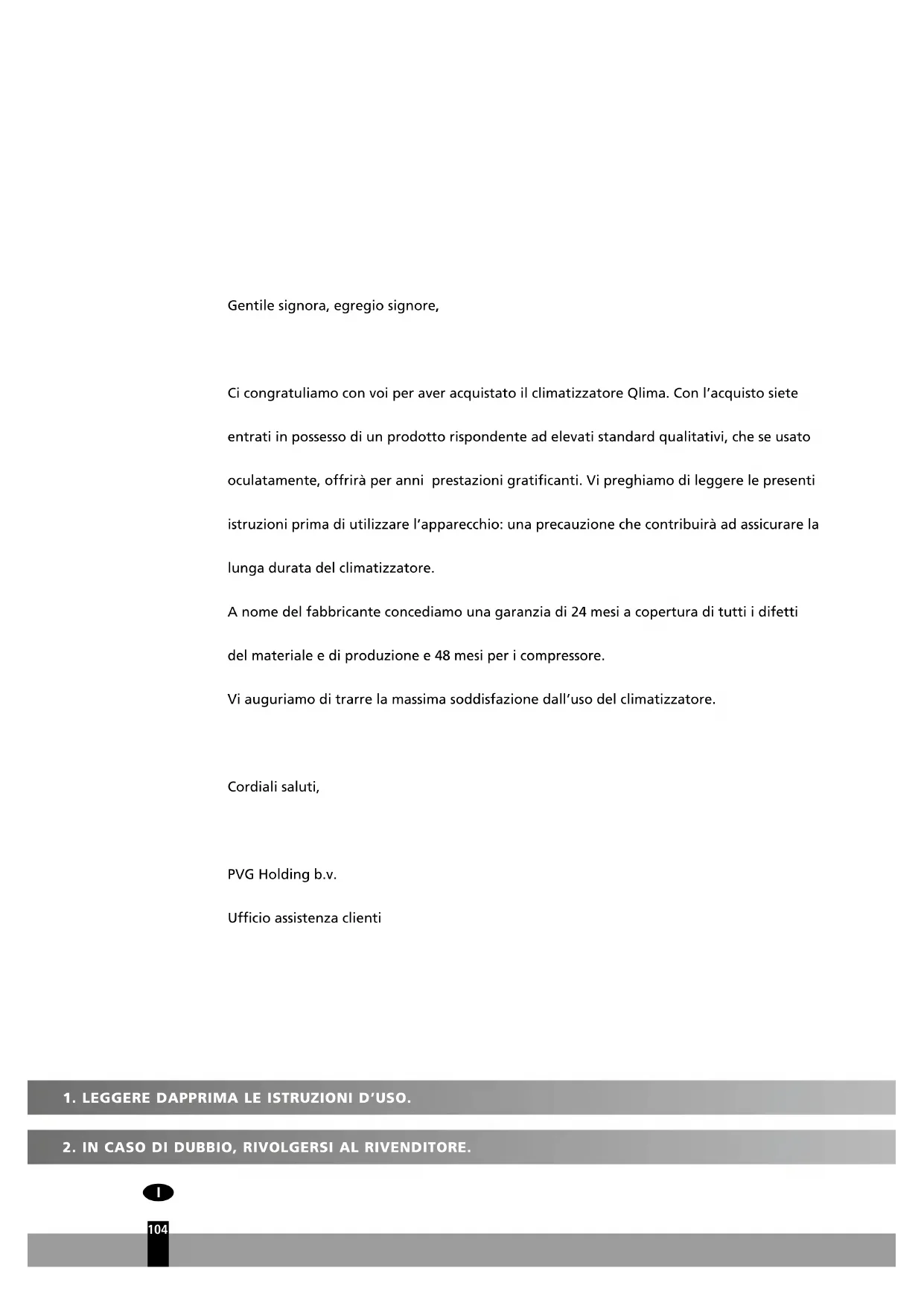 Gentile signora, egregio signore, Ci congratuliamo con voi per aver acquistato il climatizzatore Qlima. Con l’acquisto siete entrati in possesso di un prodotto rispondente ad elevati standard qualitativi, che se usato oculatamente, offrirà per anni prestazioni gratificanti. Vi preghiamo di leggere le presenti istruzioni prima di utilizzare l’apparecchio: una precauzione che contribuirà ad assicurare la lunga durata del climatizzatore. A nome del fabbricante concediamo una garanzia di 24 mesi a copertura di tutti i difetti del materiale e di produzione e 48 mesi per i compressore. Vi auguriamo di trarre la massima soddisfazione dall’uso del climatizzatore. Cordiali saluti, PVG Holding b.v. Ufficio assistenza clienti