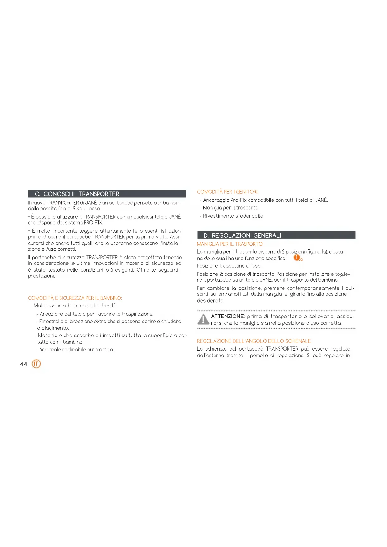 ISTRUZIONI - IMPORTANTE : leggere attentamente le presenti istruzioni pri- ma dell’uso e conservarle per consultazioni future. AVVERTENZE: - Questo prodotto è adatto solo a bambini che non sono in grado di stare seduti da soli. - Non lasciare mai il bambino privo di vigilanza. - Non lasciar giocare altri bambini nei pressi del portabebè senza vigilanza. - Non utilizzare se una o più parti sono rotte, usurate o mancanti. - Non utilizzare questo portabebè su un supporto. - Non aggiungere materassini. - Utilizzare solo su una supercie stabile, orizzontale, piana e asciutta. - Non usare mai questo portabebè portatile senza ssarlo al telaio del passeggino, come indicato nelle istruzioni. - Per motivi di sicurezza, non utilizzare su pendii con un’inclinazione superiore a 12°, perché la stabilità del passeggino potrebbe risulta- re compromessa. - Non posizionare il portabebè portatile su superci elevate come tavoli, letti ecc., poiché sussiste il rischio di caduta. RESTRIZIONI D’USO: - Utilizzare solamente componenti originali JANÉ. - Attivare sempre il freno del passeggino prima di installare o rimuovere il portabebè TRANSPORTER. - Tenere sempre in considerazione il rischio provocato dal fuo- co e da altre fonti di calore come radiatori, fuochi a gas ecc., quando si trovano vicino al portabebè. - Le maniglie e il fondo del portabebè vanno ispezionati rego- larmente per individuare segni di danneggiamento o usura. - Questo portabebè è pensato per bambini dalla nascita no a 9 Kg di peso. - Questo prodotto è adatto a bambini che non sono in grado di sedersi da soli, di girarsi o di alzarsi appoggiandosi con le mani e le ginocchia. Peso massimo del bambino: 9 Kg. - Non salire né scendere le scale con il passeggino. - Vericare che la testa del bambino si trovi in una posizione più elevata rispetto al resto del corpo. RACCOMANDAZIONI - Conservare il presente libretto di istruzioni per consultazioni future. Conservarlo sempre nella tasca che si trova nel rivesti- mento, nella zona dei piedi.43