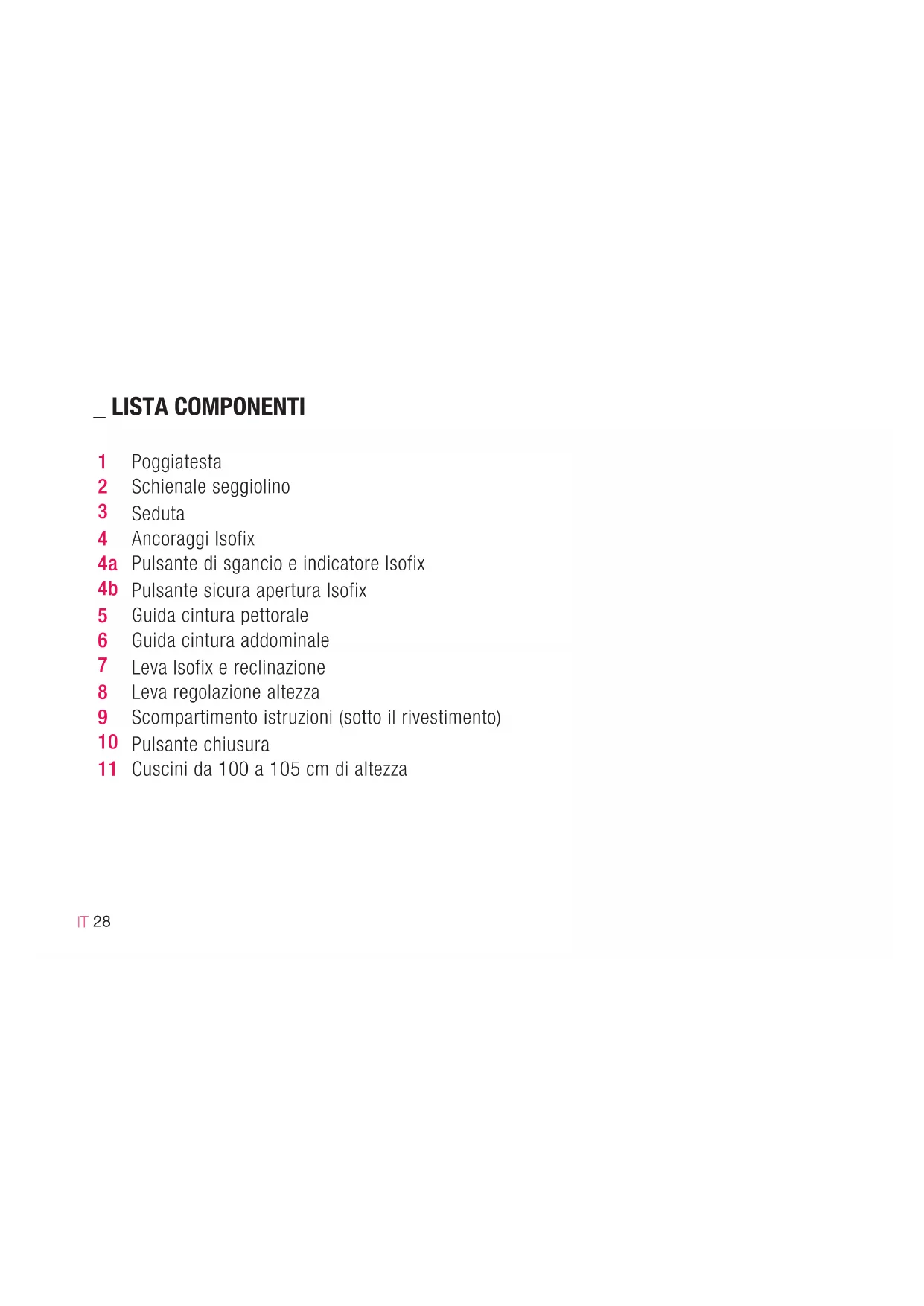 _ LISTA COMPONENTI Poggiatesta Schienale seggiolino Seduta Ancoraggi Isofix Pulsante di sgancio e indicatore Isofix Pulsante sicura apertura Isofix Guida cintura pettorale Guida cintura addominale Leva Isofix e reclinazione Leva regolazione altezza Scompartimento istruzioni (sotto il rivestimento) Pulsante chiusura Cuscini da 100 a 105 cm di altezza