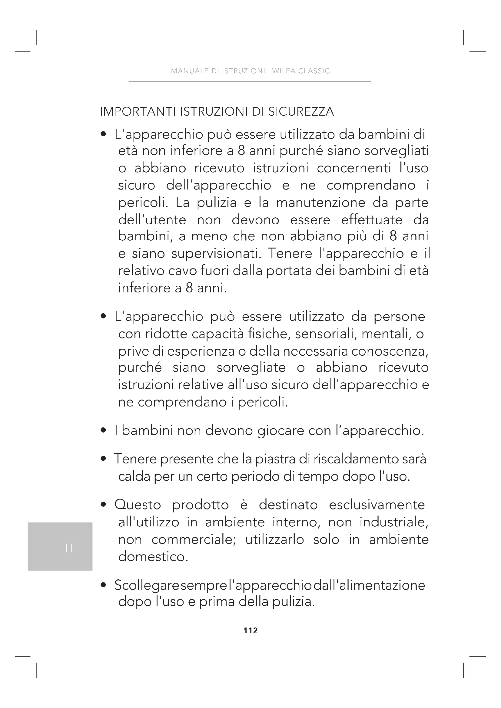Per ricevere assistenza, visitare il sito wilfa.com e consultare la nostra pagina dedicata all'assistenza clienti. In questa sezione è possibile trovare domande frequenti, ricambi, consigli, suggerimenti e tutte le nostre informazioni di contatto. RICICLABILITÀ Questo marchio indica che il prodotto non deve essere smaltito insieme ad altri riuti domestici nell'intera area UE. Al ne di evitare possibili danni all'ambiente o alla salute umana derivanti dallo smaltimento incontrollato dei riuti, riciclare in modo responsabile allo scopo di promuovere il riutilizzo sostenibile delle risorse materiali. Per restituire un dispositivo dismesso, servirsi dei sistemi di restituzione e raccolta o contattare il rivenditore presso il quale è stato acquistato il prodotto. Questo prodotto può essere smaltito presso un centro di riciclaggio ecologico gratuito.122