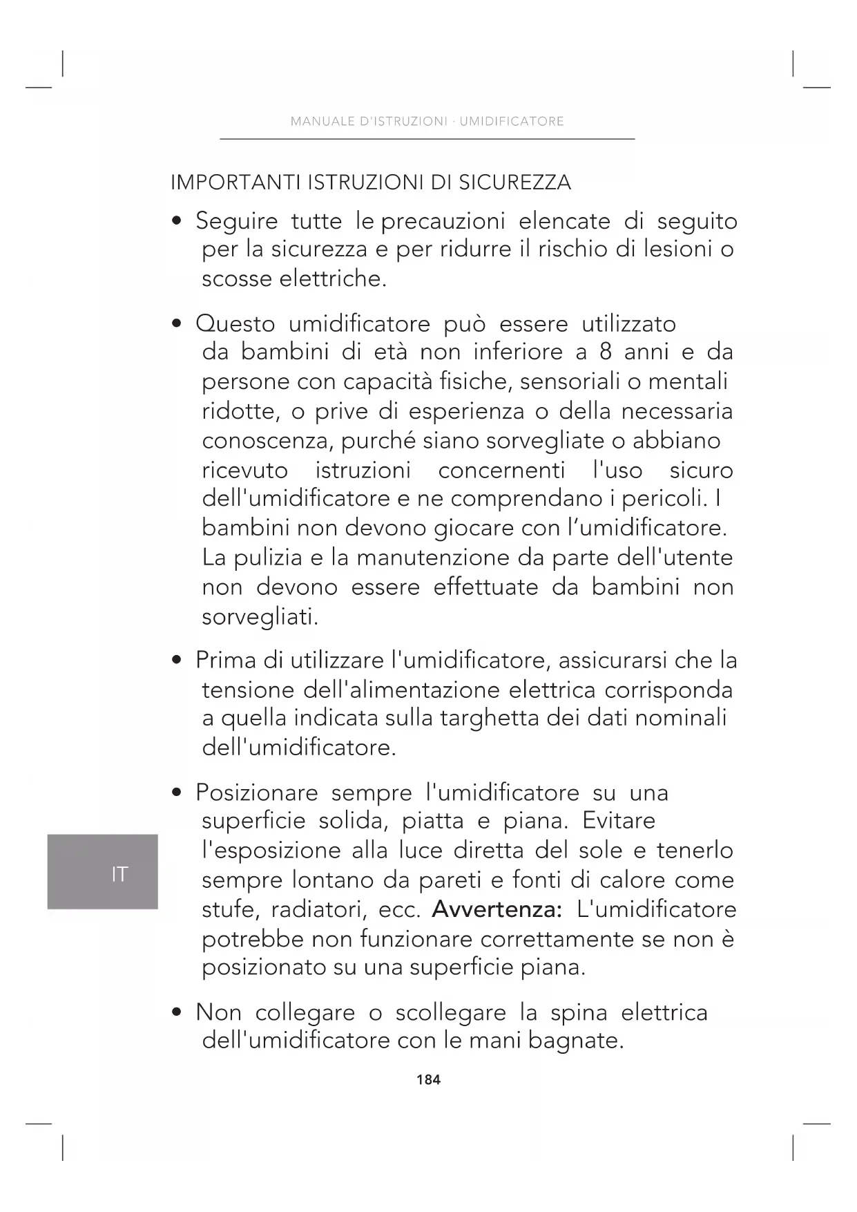 - Questo umidicatore può essere utilizzato da bambini di età non inferiore a 8 anni e da persone con capacità siche, sensoriali o mentali ridotte, o prive di esperienza o della necessaria conoscenza, purché siano sorvegliate o abbiano ricevuto istruzioni concernenti l'uso sicuro dell'umidicatore e ne comprendano i pericoli. I bambini non devono giocare con l’umidicatore. La pulizia e la manutenzione da parte dell'utente non devono essere effettuate da bambini non sorvegliati.