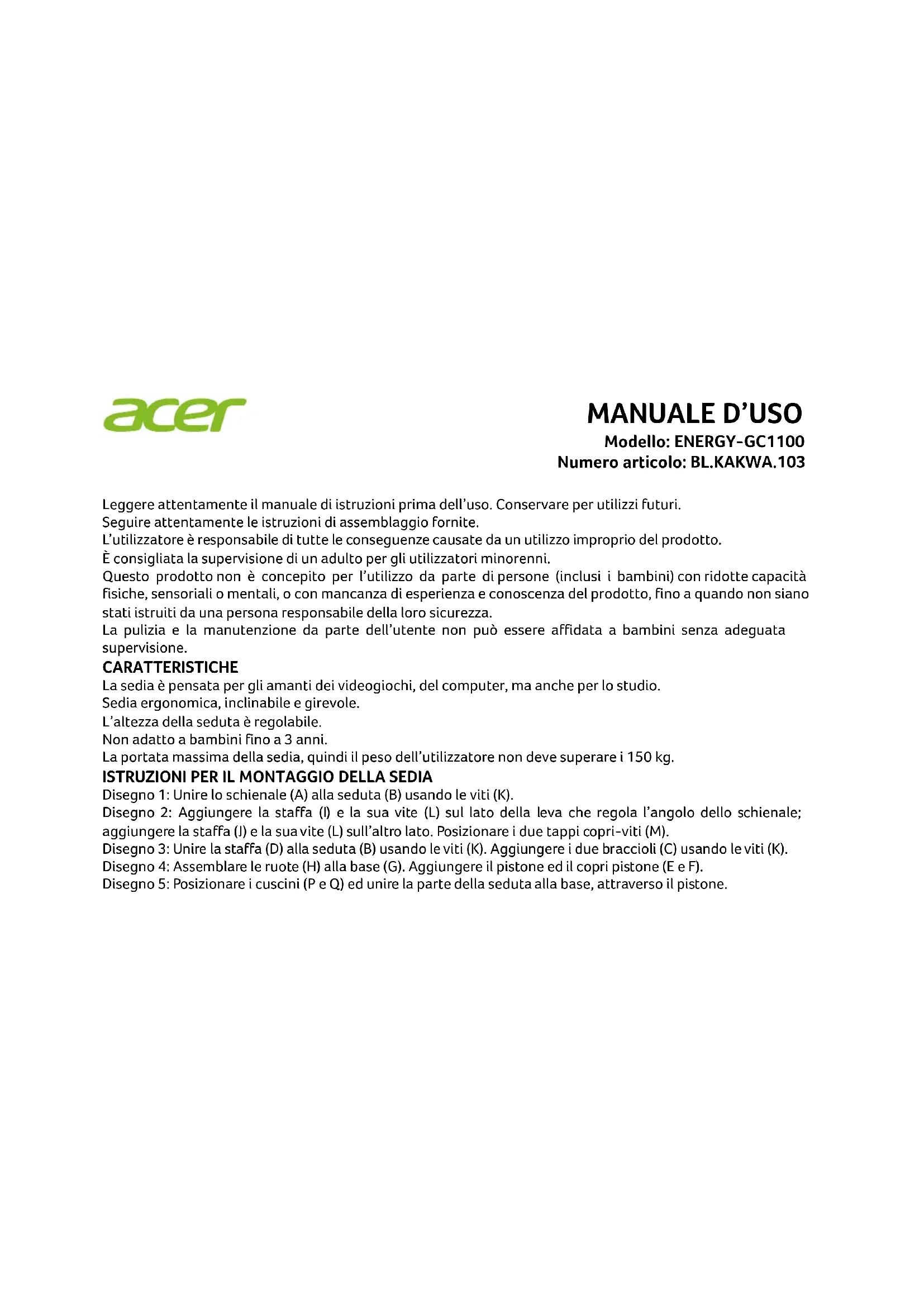 The Acer trademarks are licensed to Asia Kingston (HK) Ltd by Acer Incorporated, a Taiwan R.O.C. company.MANUALE D’USO Modello: ENERGY-GC1100 Numero articolo: BL.KAKWA.103 Leggere attentamente il manuale di istruzioni prima dell’uso. Conservare per utilizzi futuri. Seguire attentamente le istruzioni di assemblaggio fornite. L’utilizzatore è responsabile di tutte le conseguenze causate da un utilizzo improprio del prodotto. È consigliata la supervisione di un adulto per gli utilizzatori minorenni. Questo prodotto non è concepito per l’utilizzo da parte di persone (inclusi i bambini) con ridotte capacità fisiche, sensoriali o mentali, o con mancanza di esperienza e conoscenza del prodotto, fino a quando non siano stati istruiti da una persona responsabile della loro sicurezza. La pulizia e la manutenzione da parte dell’utente non può essere affidata a bambini senza adeguata supervisione. CARATTERISTICHE La sedia è pensata per gli amanti dei videogiochi, del computer, ma anche per lo studio. Sedia ergonomica, inclinabile e girevole. L’altezza della seduta è regolabile. Non adatto a bambini fino a 3 anni. La portata massima della sedia, quindi il peso dell’utilizzatore non deve superare i 150 kg.