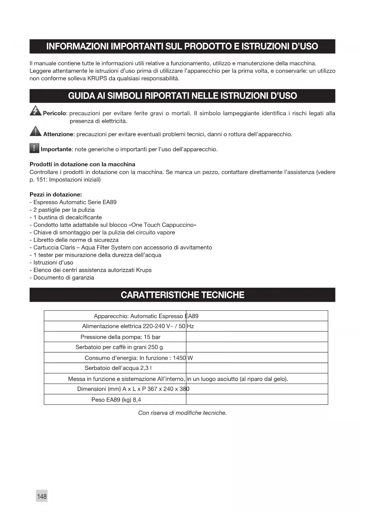 Importante: note generiche o importanti per l’uso dell’apparecchio. Prodotti in dotazione con la macchina Controllare i prodotti in dotazione con la macchina. Se manca un pezzo, contattare direttamente l’assistenza (vedere p. 151: Impostazioni iniziali) Pezzi in dotazione: - Espresso Automatic Serie EA89 - 2 pastiglie per la pulizia - 1 bustina di decalcicante - Condotto latte adattabile sul blocco «One Touch Cappuccino» - Chiave di smontaggio per la pulizia del circuito vapore - Libretto delle norme di sicurezza - Cartuccia Claris – Aqua Filter System con accessorio di avvitamento - 1 tester per misurazione della durezza dell’acqua - Istruzioni d’uso - Elenco dei centri assistenza autorizzati Krups - Documento di garanzia CARATTERISTICHE TECNICHE Apparecchio: Automatic Espresso EA89 Alimentazione elettrica 220-240 V~ / 50 Hz Pressione della pompa: 15 bar Serbatoio per caffè in grani 250 g Consumo d’energia: In funzione : 1450 W Serbatoio dell’acqua 2,3 l Messa in funzione e sistemazione All’interno, in un luogo asciutto (al riparo dal gelo). Dimensioni (mm) A x L x P 367 x 240 x 380 Peso EA89 (kg) 8,4 Con riserva di modiche tecniche.149