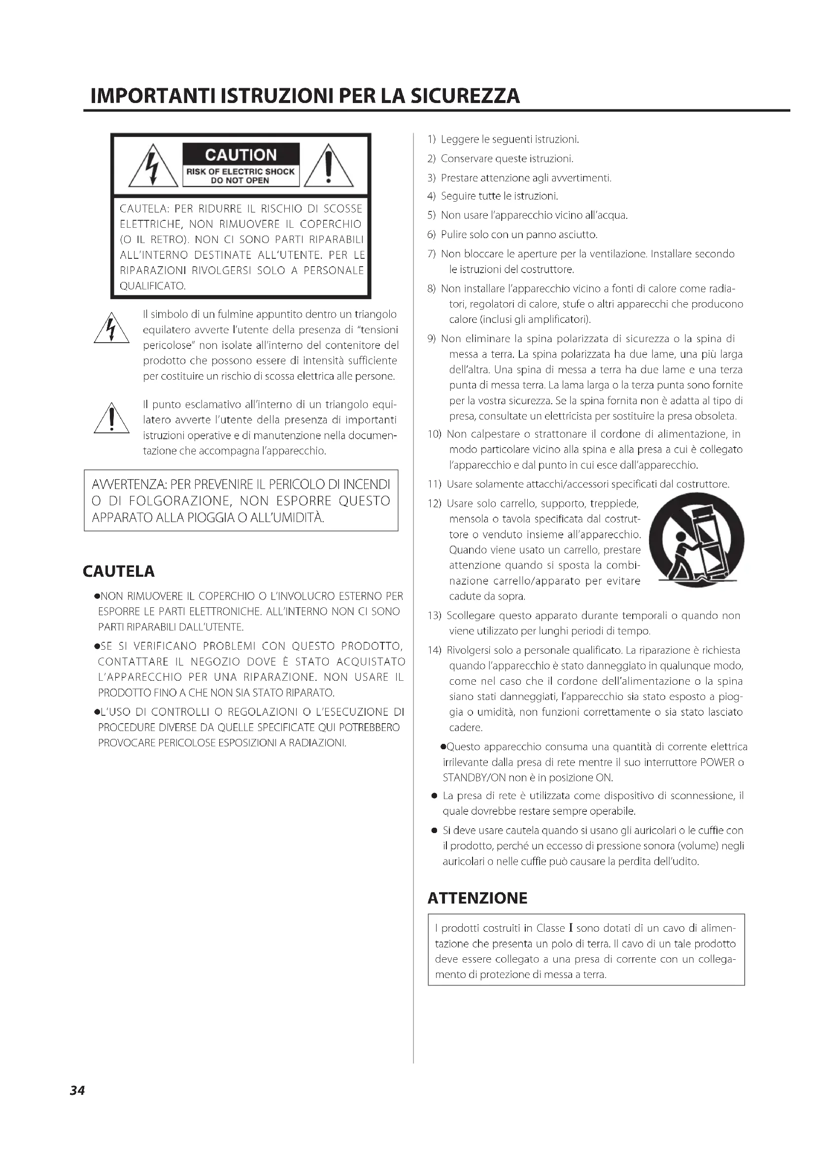 quando l’apparecchio è stato danneggiato in qualunque modo, come nel caso che il cordone dell’alimentazione o la spina siano stati danneggiati, l’apparecchio sia stato esposto a piog- gia o umidità, non funzioni correttamente o sia stato lasciato cadere. o Questo apparecchio consuma una quantità di corrente elettrica irrilevante dalla presa di rete mentre il suo interruttore POWER o STANDBY/ON non è in posizione ON. o La presa di rete è utilizzata come dispositivo di sconnessione, il quale dovrebbe restare sempre operabile. o Si deve usare cautela quando si usano gli auricolari o le cuffie con il prodotto, perché un eccesso di pressione sonora (volume) negli auricolari o nelle cuffie può causare la perdita dell’udito. ATTENZIONE I prodotti costruiti in Classe ! sono dotati di un cavo di alimen- tazione che presenta un polo di terra. Il cavo di un tale prodotto deve essere collegato a una presa di corrente con un collega- mento di protezione di messa a terra.IT