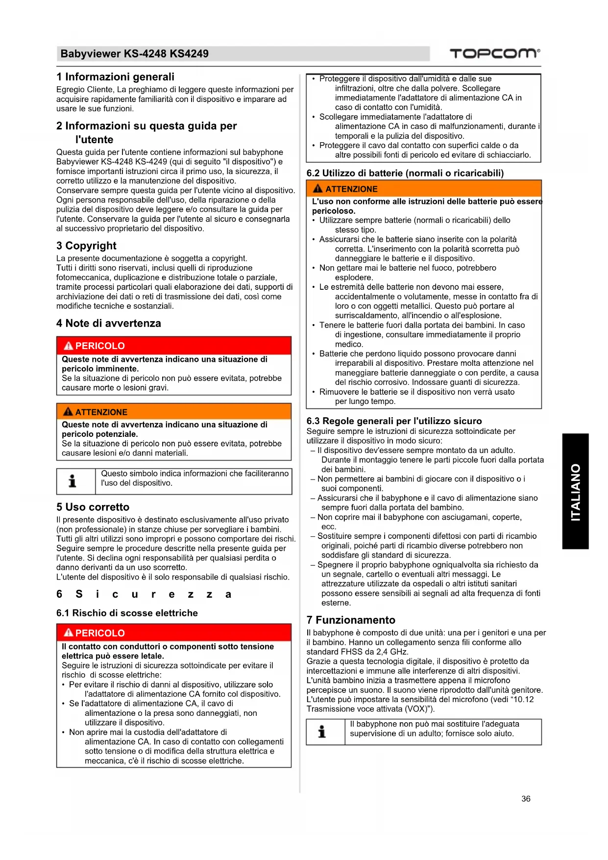 ITALIANO 1 Informazioni generali Egregio Cliente, La preghiamo di leggere queste informazioni per acquisire rapidamente familiarità con il dispositivo e imparare ad usare le sue funzioni. 2 Informazioni su questa guida per l'utente Questa guida per l'utente contiene informazioni sul babyphone Babyviewer KS-4248 KS-4249 (qui di seguito "il dispositivo") e fornisce importanti istruzioni circa il primo uso, la sicurezza, il corretto utilizzo e la manutenzione del dispositivo. Conservare sempre questa guida per l'utente vicino al dispositivo. Ogni persona responsabile dell'uso, della riparazione o della pulizia del dispositivo deve leggere e/o consultare la guida per l'utente. Conservare la guida per l'utente al sicuro e consegnarla al successivo proprietario del dispositivo. 3 Copyright La presente documentazione è soggetta a copyright. Tutti i diritti sono riservati, inclusi quelli di riproduzione fotomeccanica, duplicazione e distribuzione totale o parziale, tramite processi particolari quali elaborazione dei dati, supporti di archiviazione dei dati o reti di trasmissione dei dati, così come modifiche tecniche e sostanziali. 4 Note di avvertenza 5 Uso corretto Il presente dispositivo è destinato esclusivamente all'uso privato (non professionale) in stanze chiuse per sorvegliare i bambini. Tutti gli altri utilizzi sono impropri e possono comportare dei rischi. Seguire sempre le procedure descritte nella presente guida per l'utente. Si declina ogni responsabilità per qualsiasi perdita o danno derivanti da un uso scorretto. L'utente del dispositivo è il solo responsabile di qualsiasi rischio. 6Sicurezza