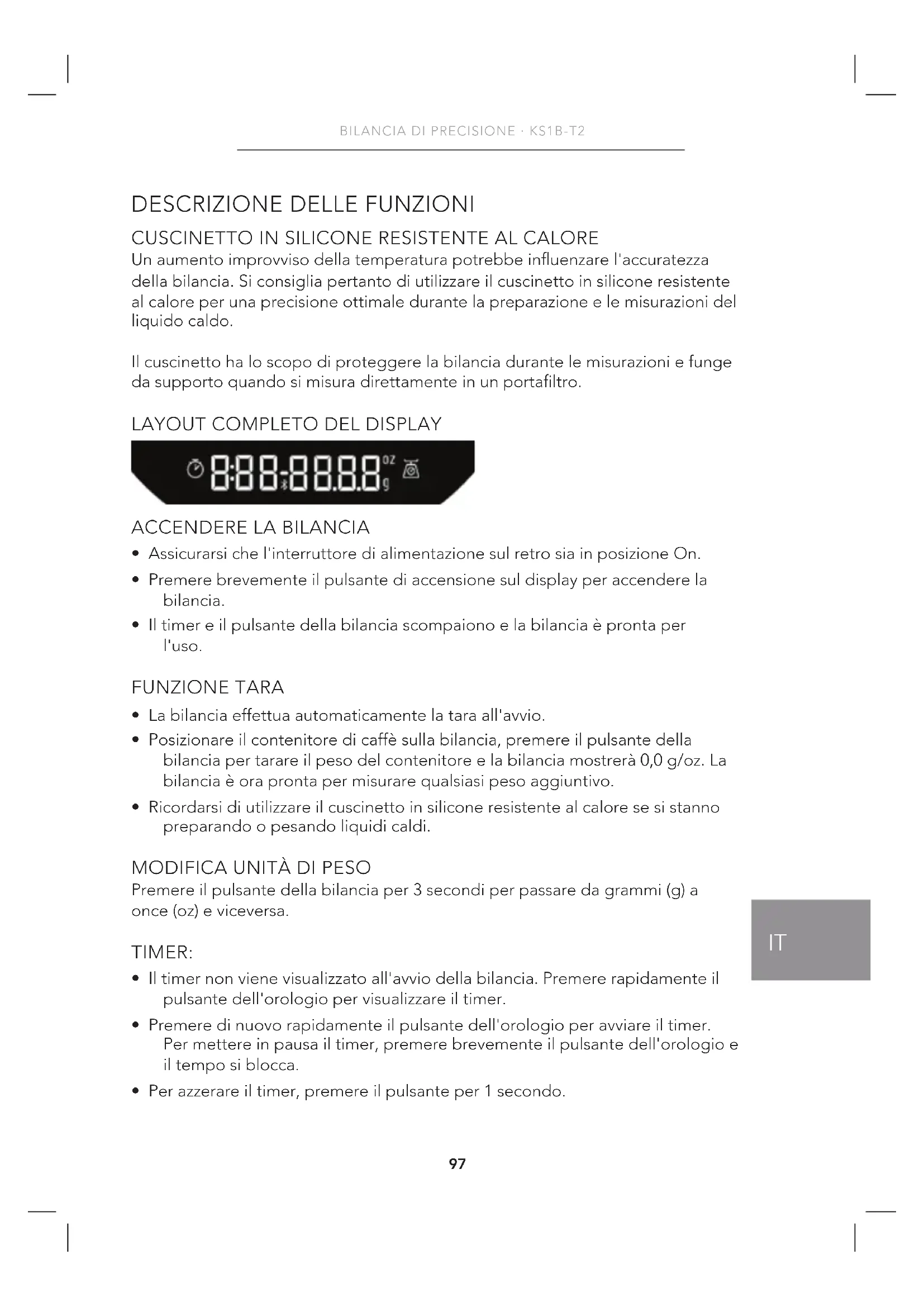 - Premendo brevemente il pulsante di accensione si tara la bilancia e contemporaneamente si azzera il timer.100