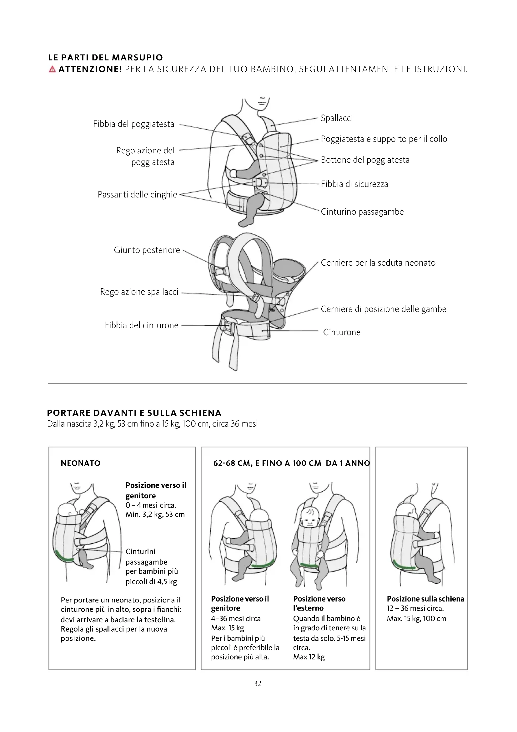Dalla nascita 3,2 kg, 53 cm fino a 15 kg, 100 cm, circa 36 mesi Posizione verso l'esterno Quando il bambino è in grado di tenere su la testa da solo. 5-15 mesi circa. Max 12 kg Posizione sulla schiena 12 – 36 mesi circa. Max. 15 kg, 100 cm Posizione verso il genitore 4–36 mesi circa Max. 15 kg Per i bambini più piccoli è preferibile la posizione più alta. Fibbia del poggiatesta Passanti delle cinghie Spallacci Poggiatesta e supporto per il collo Bottone del poggiatesta Fibbia di sicurezza Cinturino passagambe Giunto posteriore Fibbia del cinturone Regolazione spallacci Cerniere di posizione delle gambe Cinturone Cerniere per la seduta neonato Regolazione del poggiatesta NEONATO Per portare un neonato, posiziona il cinturone più in alto, sopra i fianchi: devi arrivare a baciare la testolina. Regola gli spallacci per la nuova posizione. Posizione verso il genitore 0 – 4 mesi circa. Min. 3,2 kg, 53 cm Cinturini passagambe per bambini più piccoli di 4,5 kg