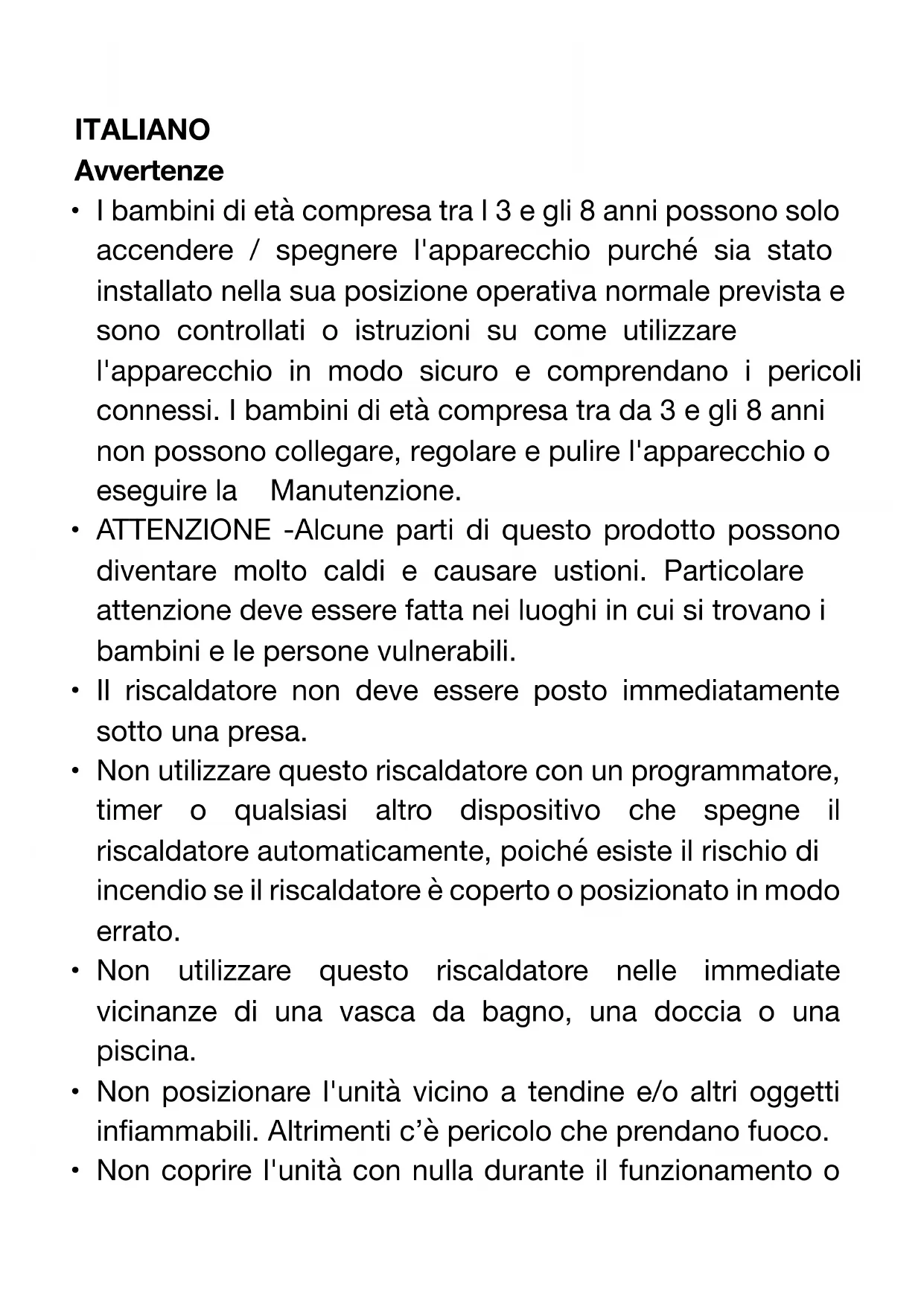 - I bambini di età compresa tra I 3 e gli 8 anni possono solo accendere / spegnere l'apparecchio purché sia stato installato nella sua posizione operativa normale prevista e sono controllati o istruzioni su come utilizzare l'apparecchio in modo sicuro e comprendano i pericoli connessi. I bambini di età compresa tra da 3 e gli 8 anni non possono collegare, regolare e pulire l'apparecchio o eseguire la Manutenzione.