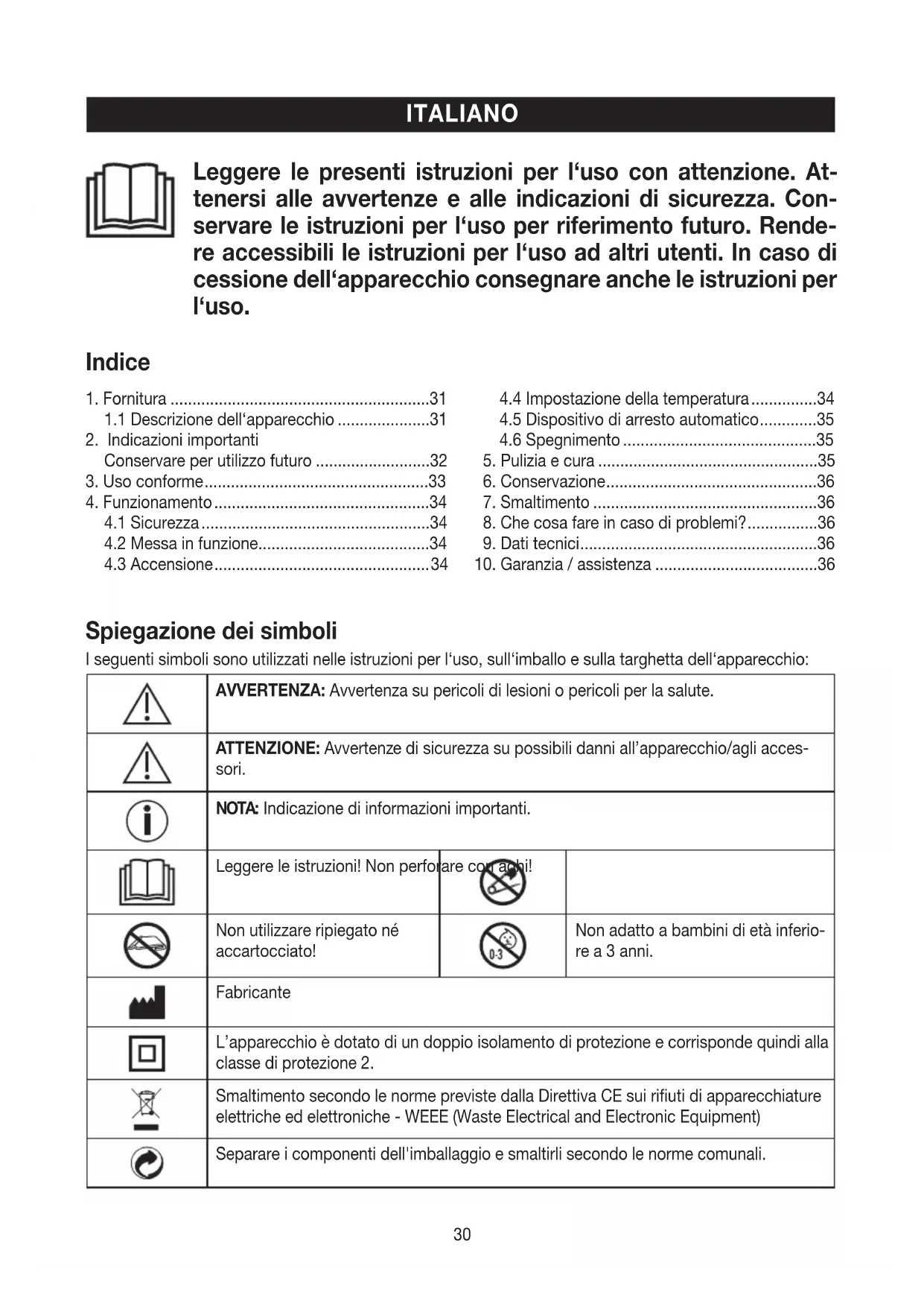 Encontrará más información sobre la garantía y las condiciones de la misma en el folleto de garantía suministrado. Salvo errores y modificaciones30 Spiegazione dei simboli I seguenti simboli sono utilizzati nelle istruzioni per l‘uso, sull‘imballo e sulla targhetta dell‘apparecchio: AVVERTENZA: Avvertenza su pericoli di lesioni o pericoli per la salute. ATTENZIONE: Avvertenze di sicurezza su possibili danni all’apparecchio/agli acces- sori. NOTA: Indicazione di informazioni importanti. Leggere le istruzioni! Non perforare con aghi! Non utilizzare ripiegato né accartocciato! Non adatto a bambini di età inferio- re a 3anni. Fabricante L’apparecchio è dotato di un doppio isolamento di protezione e corrisponde quindi alla classe di protezione 2. Smaltimento secondo le norme previste dalla Direttiva CE sui rifiuti di apparecchiature elettriche ed elettroniche - WEEE (Waste Electrical and Electronic Equipment) Separare i componenti dell'imballaggio e smaltirli secondo le norme comunali. ITALIANO Leggere le presenti istruzioni per l‘uso con attenzione. At- tenersi alle avvertenze e alle indicazioni di sicurezza. Con- servare le istruzioni per l‘uso per riferimento futuro. Rende- re accessibili le istruzioni per l‘uso ad altri utenti. In caso di cessione dell‘apparecchio consegnare anche le istruzioni per l‘uso.
