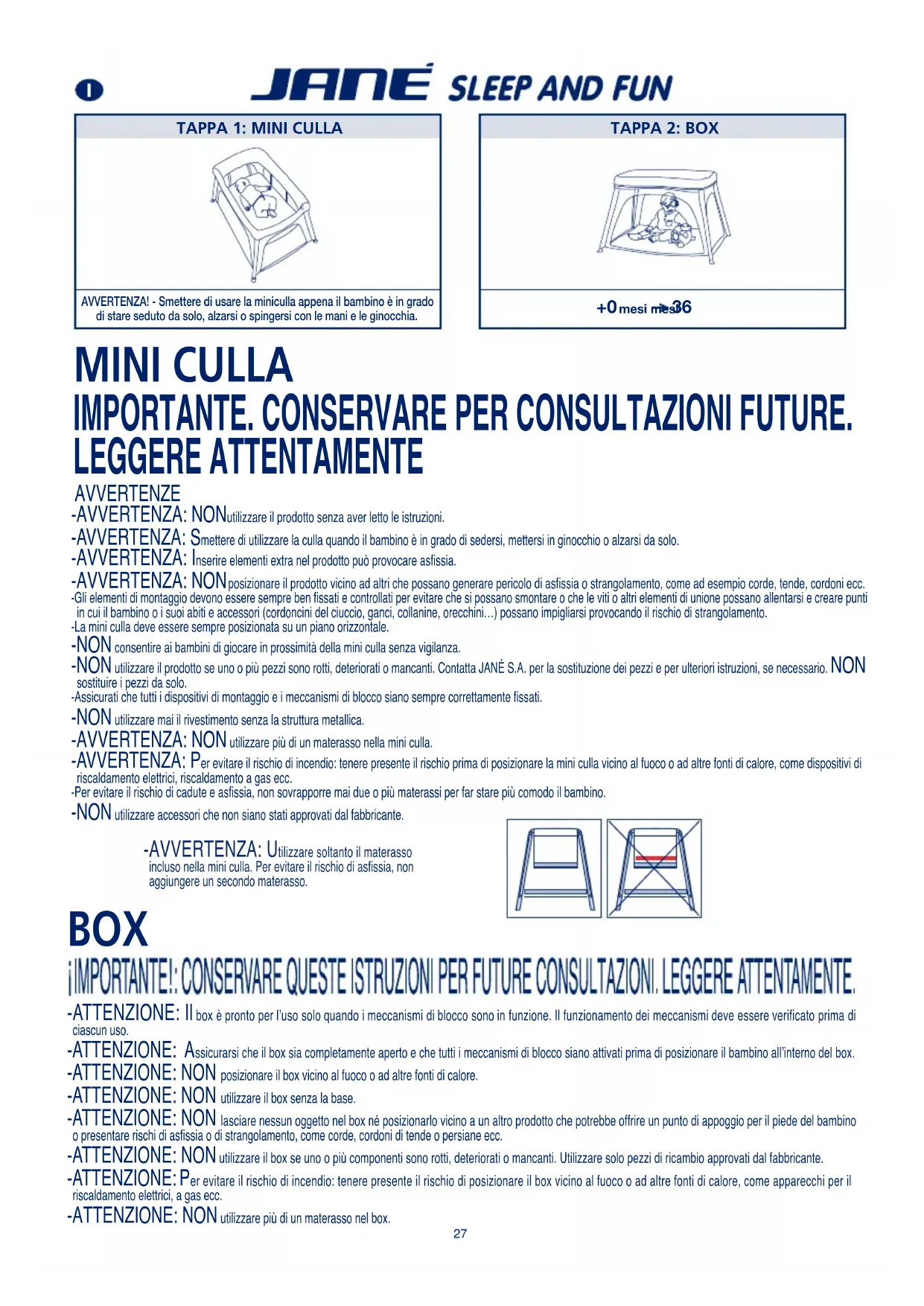 mesi mesi +0 36 TAPPA 2: BOX -ATTENZIONE: Il box è pronto per l’uso solo quando i meccanismi di blocco sono in funzione. Il funzionamento dei meccanismi deve essere verificato prima di ciascun uso. -ATTENZIONE: Assicurarsi che il box sia completamente aperto e che tutti i meccanismi di blocco siano attivati prima di posizionare il bambino all’interno del box. -ATTENZIONE: NON posizionare il box vicino al fuoco o ad altre fonti di calore. -ATTENZIONE: NON utilizzare il box senza la base. -ATTENZIONE: NON lasciare nessun oggetto nel box né posizionarlo vicino a un altro prodotto che potrebbe offrire un punto di appoggio per il piede del bambino o presentare rischi di asfissia o di strangolamento, come corde, cordoni di tende o persiane ecc. -ATTENZIONE: NON utilizzare il box se uno o più componenti sono rotti, deteriorati o mancanti. Utilizzare solo pezzi di ricambio approvati dal fabbricante. -ATTENZIONE: Per evitare il rischio di incendio: tenere presente il rischio di posizionare il box vicino al fuoco o ad altre fonti di calore, come apparecchi per il riscaldamento elettrici, a gas ecc. -ATTENZIONE: NON utilizzare più di un materasso nel box. -AVVERTENZA: Utilizzare soltanto il materasso incluso nella mini culla. Per evitare il rischio di asfissia, non aggiungere un secondo materasso. IMPORTANTE. CONSERVARE PER CONSULTAZIONI FUTURE. LEGGERE ATTENTAMENTE AVVERTENZE -AVVERTENZA: NON utilizzare il prodotto senza aver letto le istruzioni. -AVVERTENZA: Smettere di utilizzare la culla quando il bambino è in grado di sedersi, mettersi in ginocchio o alzarsi da solo. -AVVERTENZA: Inserire elementi extra nel prodotto può provocare asfissia. -AVVERTENZA: NON posizionare il prodotto vicino ad altri che possano generare pericolo di asfissia o strangolamento, come ad esempio corde, tende, cordoni ecc. -Gli elementi di montaggio devono essere sempre ben fissati e controllati per evitare che si possano smontare o che le viti o altri elementi di unione possano allentarsi e creare punti in cui il bambino o i suoi abiti e accessori (cordoncini del ciuccio, ganci, collanine, orecchini…) possano impigliarsi provocando il rischio di strangolamento. -La mini culla deve essere sempre posizionata su un piano orizzontale. -NON consentire ai bambini di giocare in prossimità della mini culla senza vigilanza. -NON utilizzare il prodotto se uno o più pezzi sono rotti, deteriorati o mancanti. Contatta JANÉ S.A. per la sostituzione dei pezzi e per ulteriori istruzioni, se necessario. NON sostituire i pezzi da solo.-Assicurati che tutti i dispositivi di montaggio e i meccanismi di blocco siano sempre correttamente fissati. -NON utilizzare mai il rivestimento senza la struttura metallica. -AVVERTENZA: NON utilizzare più di un materasso nella mini culla. -AVVERTENZA: Per evitare il rischio di incendio: tenere presente il rischio prima di posizionare la mini culla vicino al fuoco o ad altre fonti di calore, come dispositivi di riscaldamento elettrici, riscaldamento a gas ecc. -Per evitare il rischio di cadute e asfissia, non sovrapporre mai due o più materassi per far stare più comodo il bambino. -NON utilizzare accessori che non siano stati approvati dal fabbricante.MANUTENZIONE E PULIZIA: MINI CULLA - BOX
