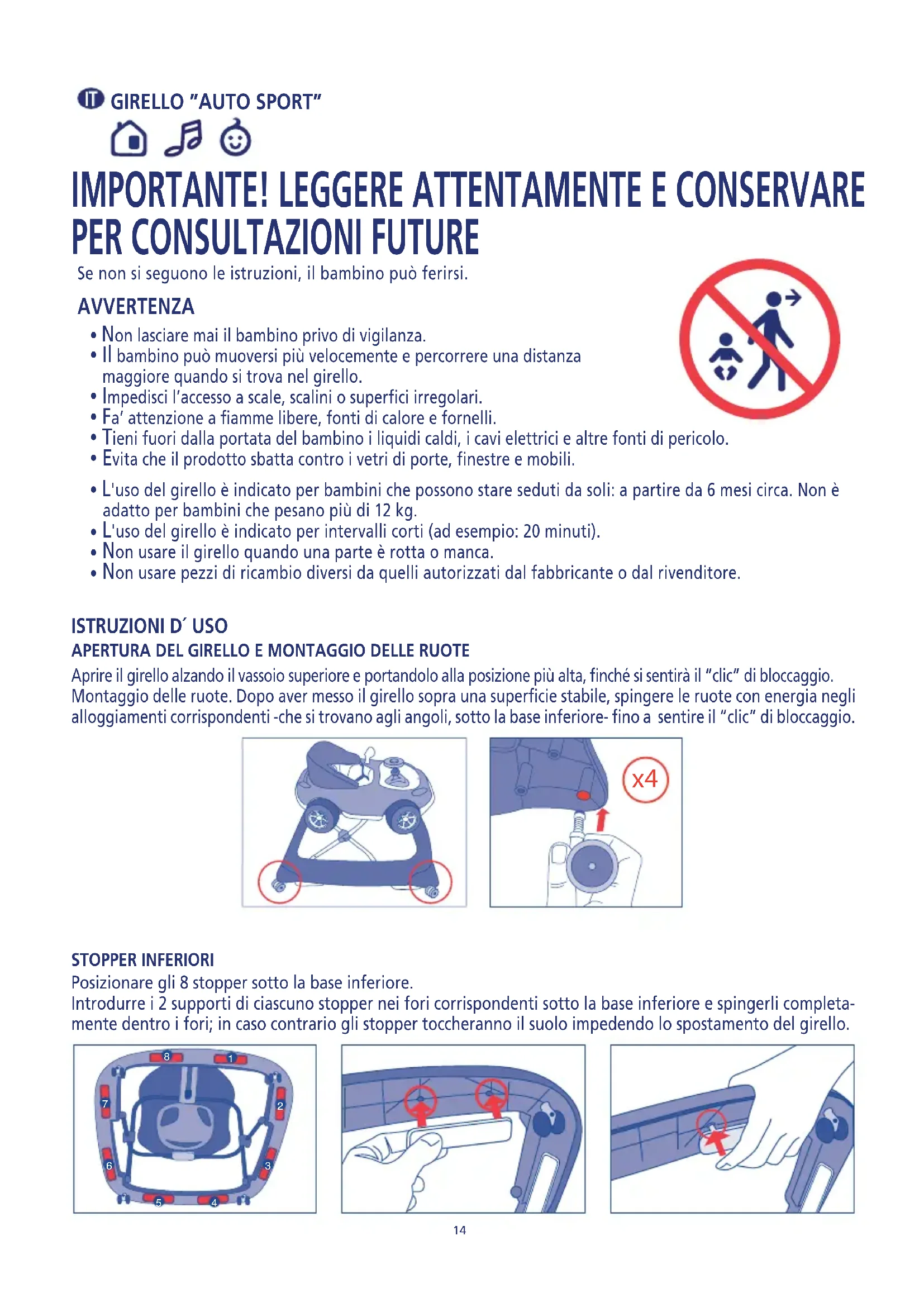 AVVERTENZA sL'uso del girello è indicato per bambini che possono stare seduti da soli: a partire da 6 mesi circa. Non è adatto per bambini che pesano più di 12 kg.