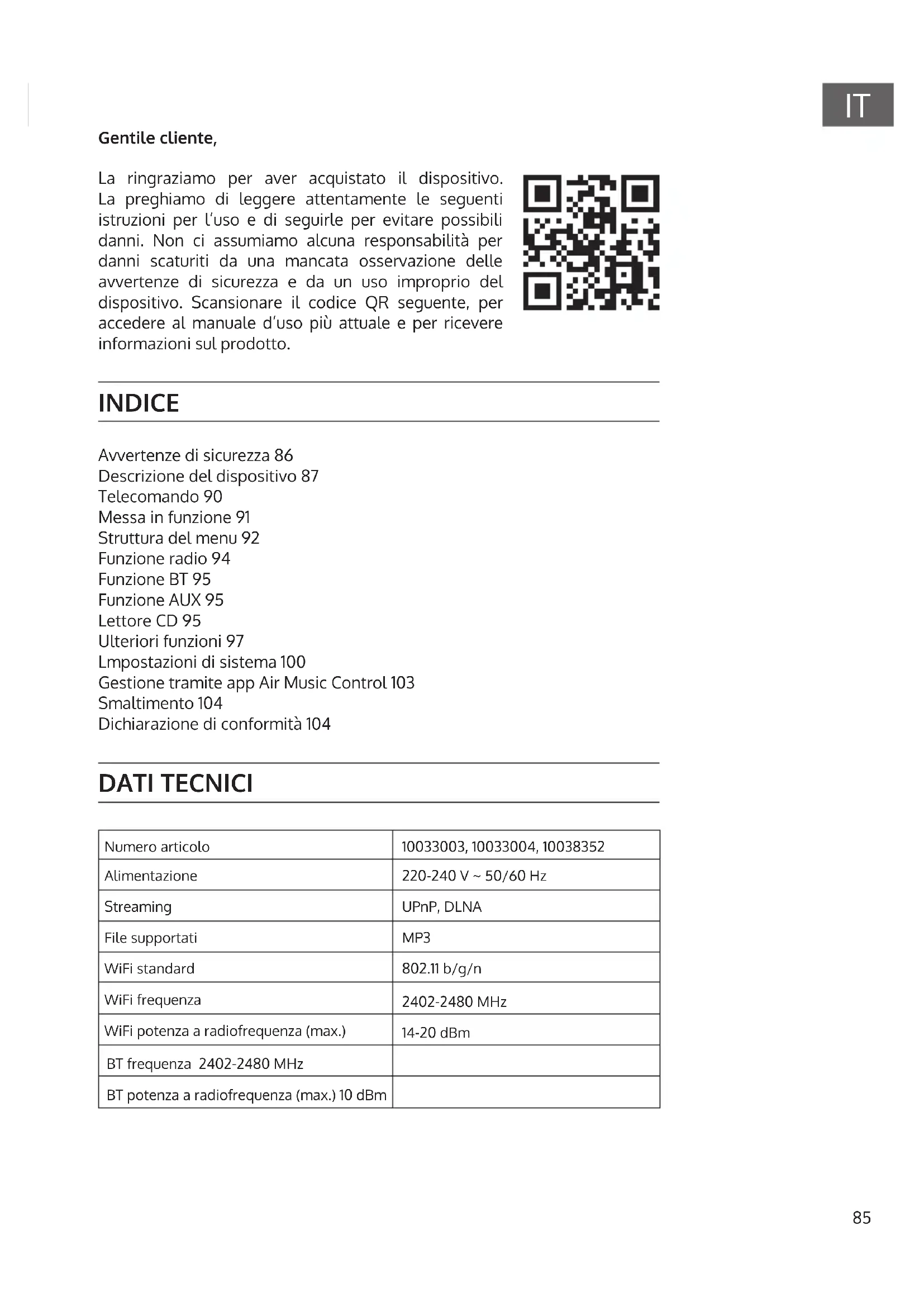 Gentile cliente, La ringraziamo per aver acquistato il dispositivo. La preghiamo di leggere attentamente le seguenti istruzioni per l’uso e di seguirle per evitare possibili danni. Non ci assumiamo alcuna responsabilità per danni scaturiti da una mancata osservazione delle avvertenze di sicurezza e da un uso improprio del dispositivo. Scansionare il codice QR seguente, per accedere al manuale d’uso più attuale e per ricevere informazioni sul prodotto. INDICE Avvertenze di sicurezza 86 Descrizione del dispositivo 87 Telecomando 90 Messa in funzione 91 Struttura del menu 92 Funzione radio 94 Funzione BT 95 Funzione AUX 95 Lettore CD 95 Ulteriori funzioni 97 Lmpostazioni di sistema 100 Gestione tramite app Air Music Control 103 Smaltimento 104 Dichiarazione di conformità 104 DATI TECNICI Numero articolo 10033003, 10033004, 10038352 Alimentazione 220-240 V ~ 50/60 Hz Streaming UPnP, DLNA File supportati MP3 WiFi standard