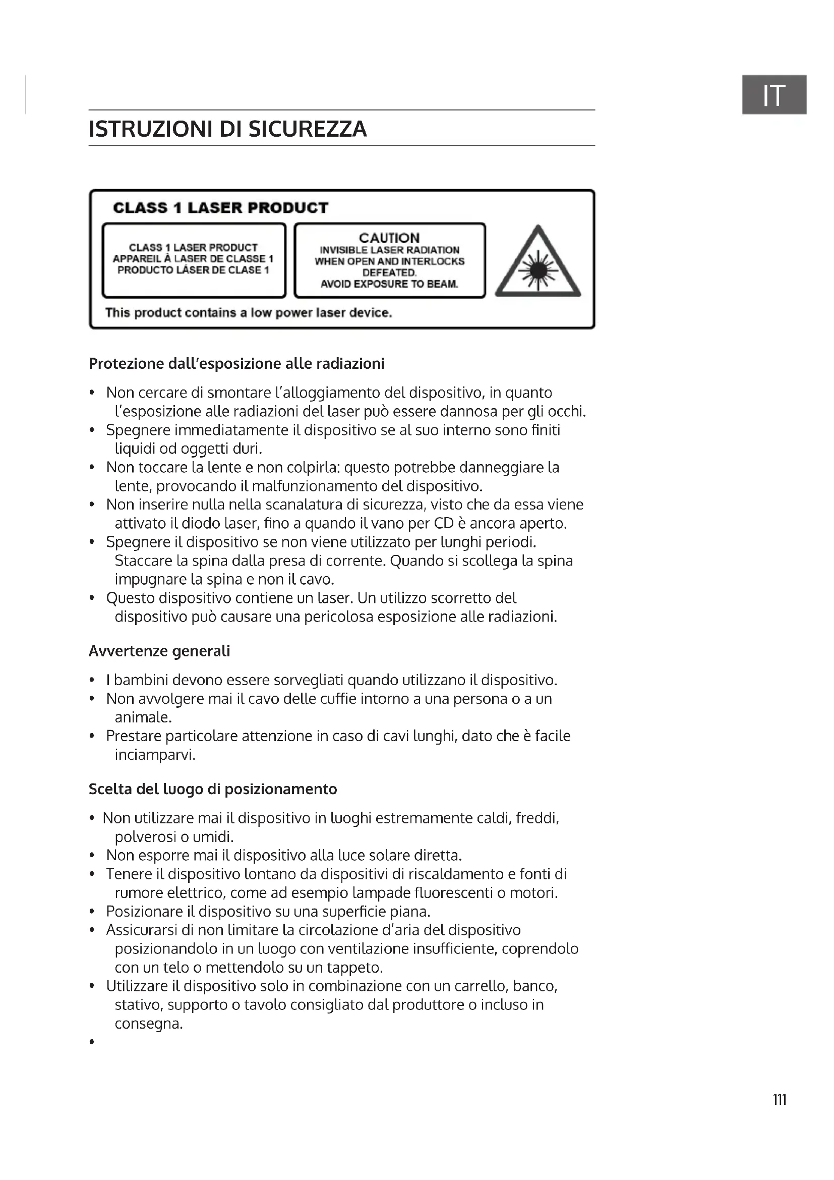 - Questo dispositivo contiene un laser. Un utilizzo scorretto del dispositivo può causare una pericolosa esposizione alle radiazioni. Avvertenze generali