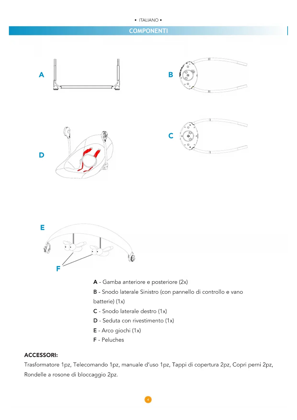 - ITALIANO • • ITALIANO • COMPONENTI A - Gamba anteriore e posteriore (2x) B - Snodo laterale Sinistro (con pannello di controllo e vano batterie) (1x) C - Snodo laterale destro (1x) D - Seduta con rivestimento (1x) E - Arco giochi (1x) F - Peluches ACCESSORI: Trasformatore 1pz, Telecomando 1pz, manuale d’uso 1pz, Tappi di copertura 2pz, Copri perni 2pz, Rondelle a rosone di bloccaggio 2pz.
