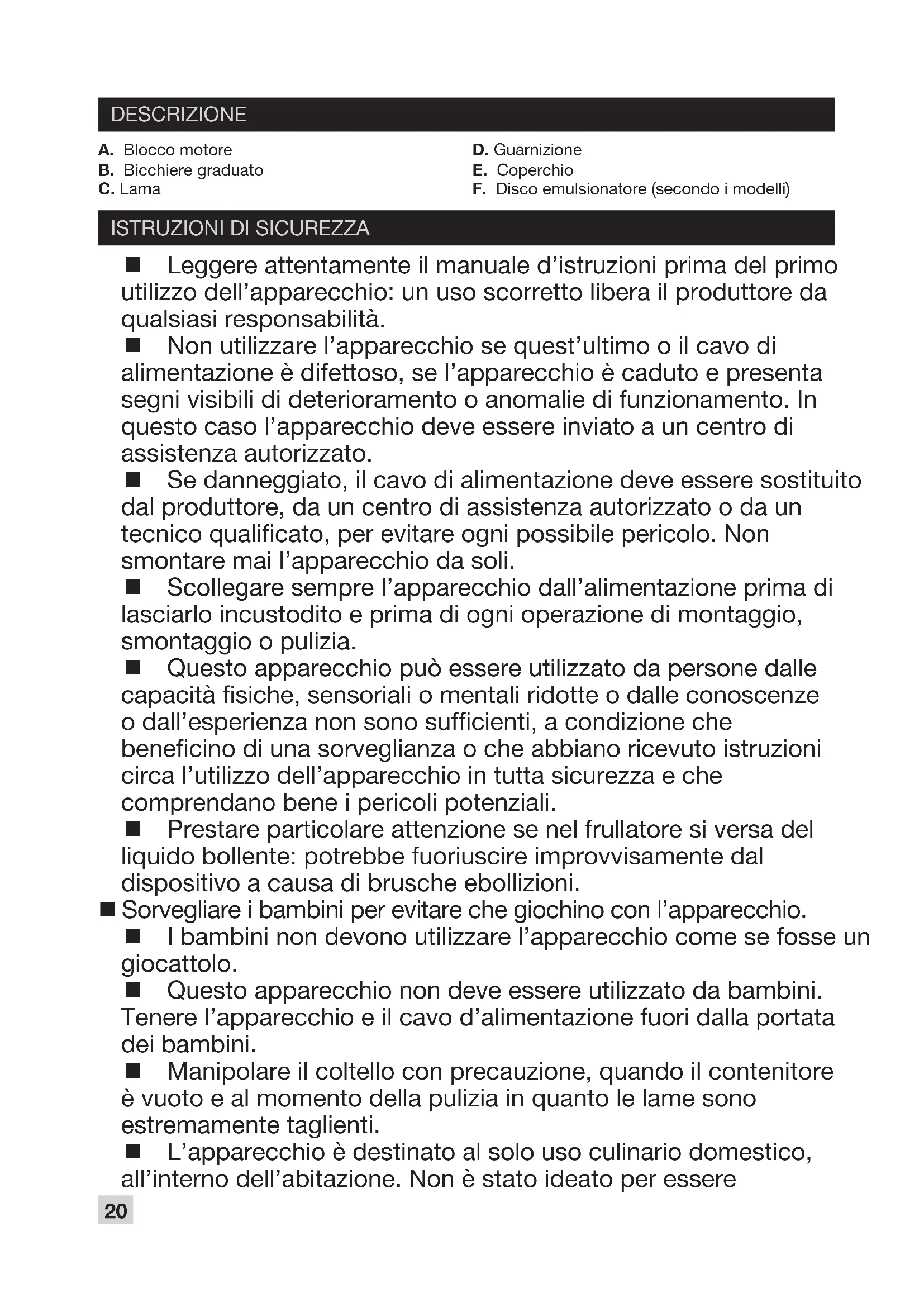A. Blocco motore B. Bicchiere graduato C. Lama D. Guarnizione E. Coperchio F. Disco emulsionatore (secondo i modelli) Leggere attentamente il manuale d’istruzioni prima del primo utilizzo dell’apparecchio: un uso scorretto libera il produttore da qualsiasi responsabilità. Non utilizzare l’apparecchio se quest’ultimo o il cavo di alimentazione è difettoso, se l’apparecchio è caduto e presenta segni visibili di deterioramento o anomalie di funzionamento. In questo caso l’apparecchio deve essere inviato a un centro di assistenza autorizzato. Se danneggiato, il cavo di alimentazione deve essere sostituito dal produttore, da un centro di assistenza autorizzato o da un tecnico qualicato, per evitare ogni possibile pericolo. Non smontare mai l’apparecchio da soli. Scollegare sempre l’apparecchio dall’alimentazione prima di lasciarlo incustodito e prima di ogni operazione di montaggio, smontaggio o pulizia. Questo apparecchio può essere utilizzato da persone dalle capacità siche, sensoriali o mentali ridotte o dalle conoscenze o dall’esperienza non sono sufcienti, a condizione che benecino di una sorveglianza o che abbiano ricevuto istruzioni circa l’utilizzo dell’apparecchio in tutta sicurezza e che comprendano bene i pericoli potenziali. Prestare particolare attenzione se nel frullatore si versa del liquido bollente: potrebbe fuoriuscire improvvisamente dal dispositivo a causa di brusche ebollizioni. Sorvegliare i bambini per evitare che giochino con l’apparecchio. I bambini non devono utilizzare l’apparecchio come se fosse un giocattolo. Questo apparecchio non deve essere utilizzato da bambini. Tenere l’apparecchio e il cavo d’alimentazione fuori dalla portata dei bambini. Manipolare il coltello con precauzione, quando il contenitore è vuoto e al momento della pulizia in quanto le lame sono estremamente taglienti. L’apparecchio è destinato al solo uso culinario domestico, all’interno dell’abitazione. Non è stato ideato per essereIT