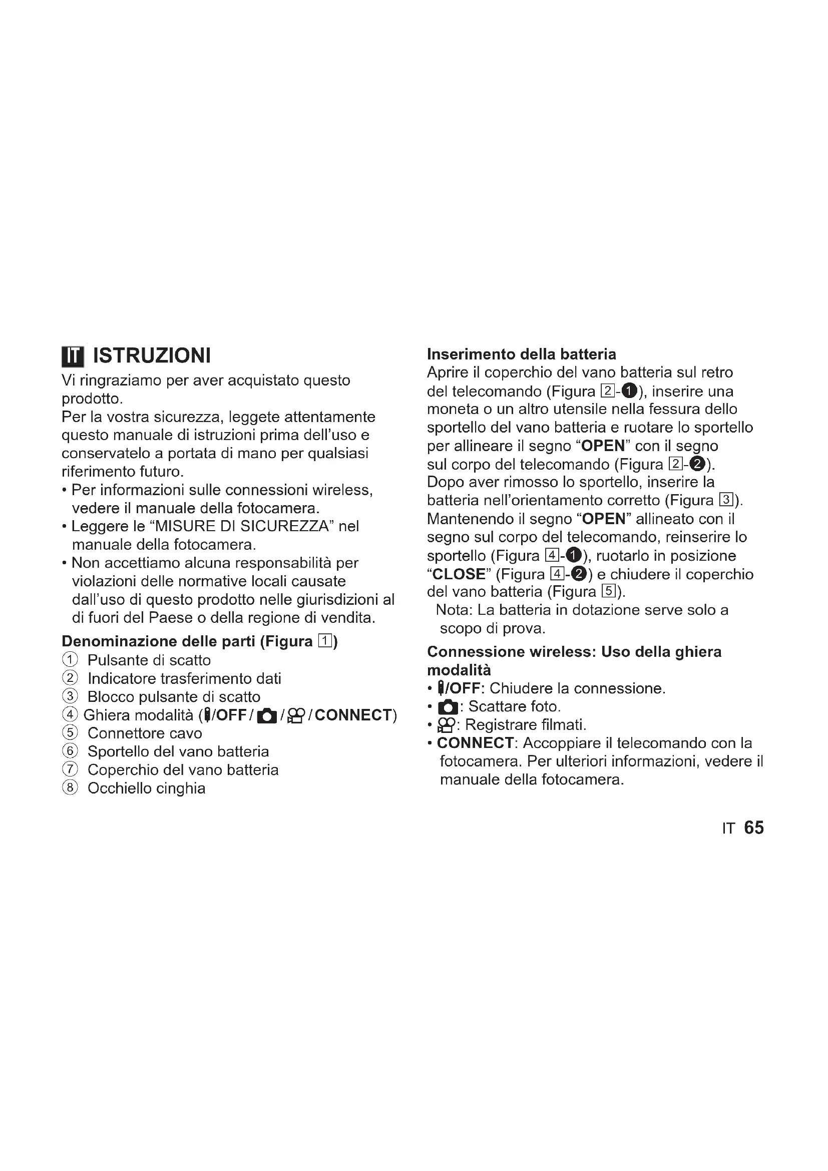 - CONNECT: Accoppiare il telecomando con la fotocamera. Per ulteriori informazioni, vedere il manuale della fotocamera. IT66 IT Collegamento cablato (Figura 6) Ruotare la ghiera modalità su b/OFF e collegare il telecomando alla fotocamera tramite il cavo in dotazione. Le foto possono essere scattate premendo il pulsante di scatto. Il telecomando wireless non è disponibile mentre il cavo è collegato. Il blocco del pulsante di scatto (Figura 6) Per la fotografia con posa B o simili, far scorrere il blocco del pulsante di scatto verso l’alto e premere il pulsante di scatto (12). Misure di sicurezza (Da leggere con attenzione)