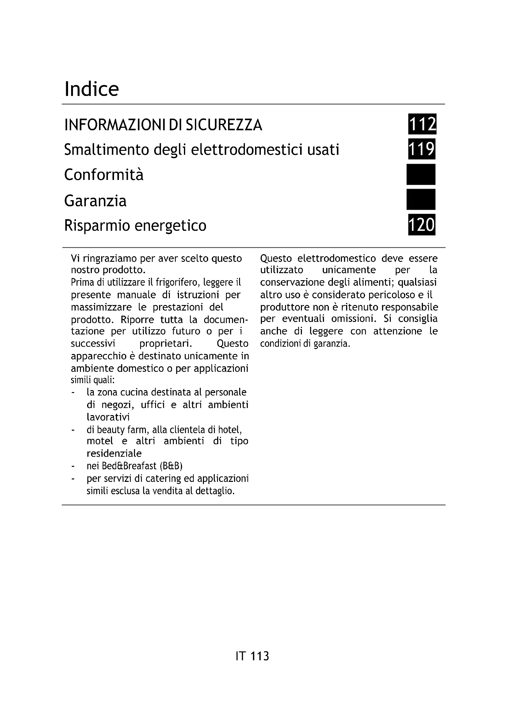 per servizi di catering ed applicazioni simili esclusa la vendita al dettaglio. Questo elettrodomestico deve essere utilizzato unicamente per la conservazione degli alimenti; qualsiasi altro uso è considerato pericoloso e il produttore non è ritenuto responsabile per eventuali omissioni. Si consiglia anche di leggere con attenzione le condizioni di garanzia.IT 114