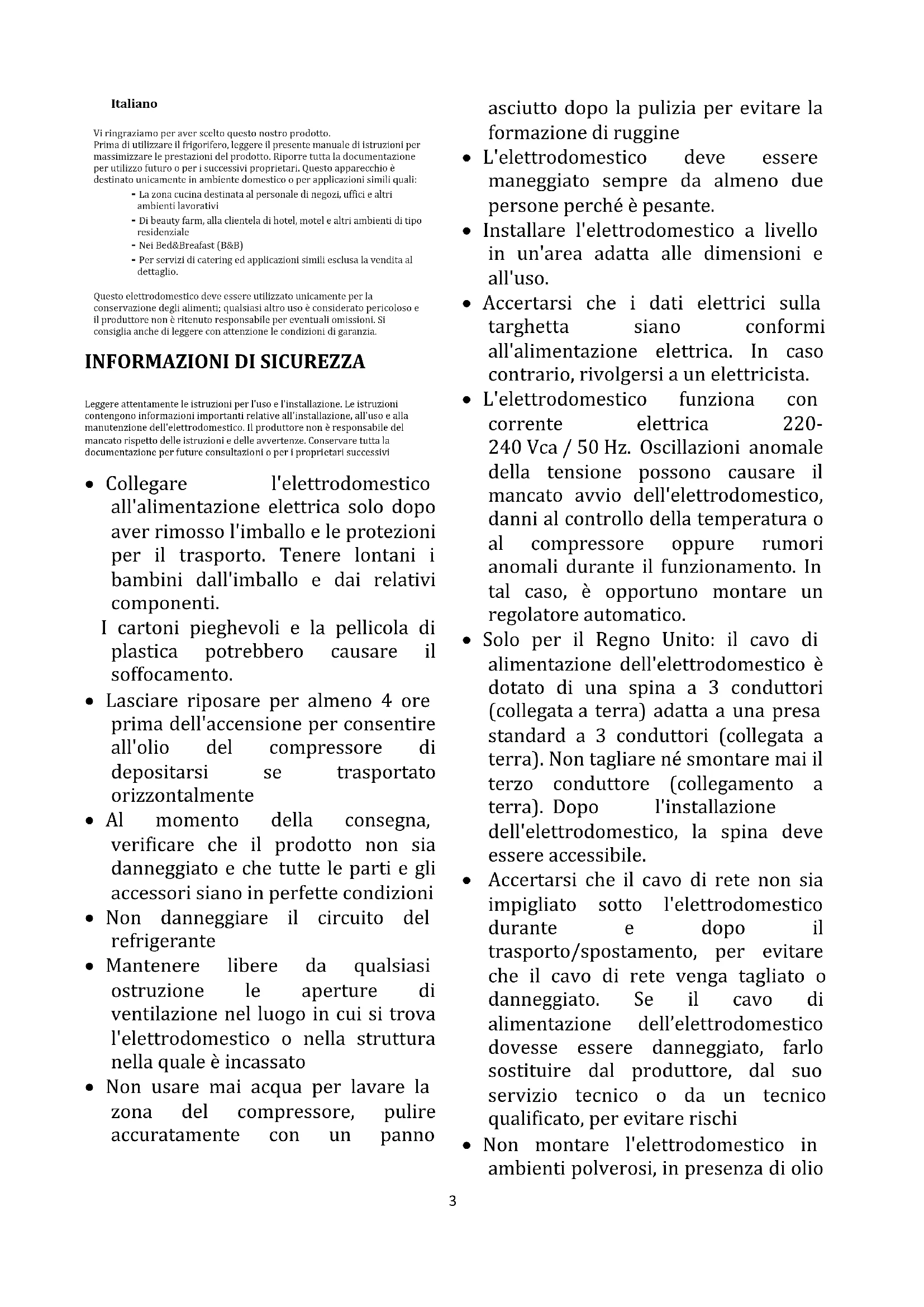 - L'elettrodomestico funziona con corrente elettrica 220- 240 Vca / 50 Hz. Oscillazioni anomale della tensione possono causare il mancato avvio dell'elettrodomestico, danni al controllo della temperatura o al compressore oppure rumori anomali durante il funzionamento. In tal caso, è opportuno montare un regolatore automatico.