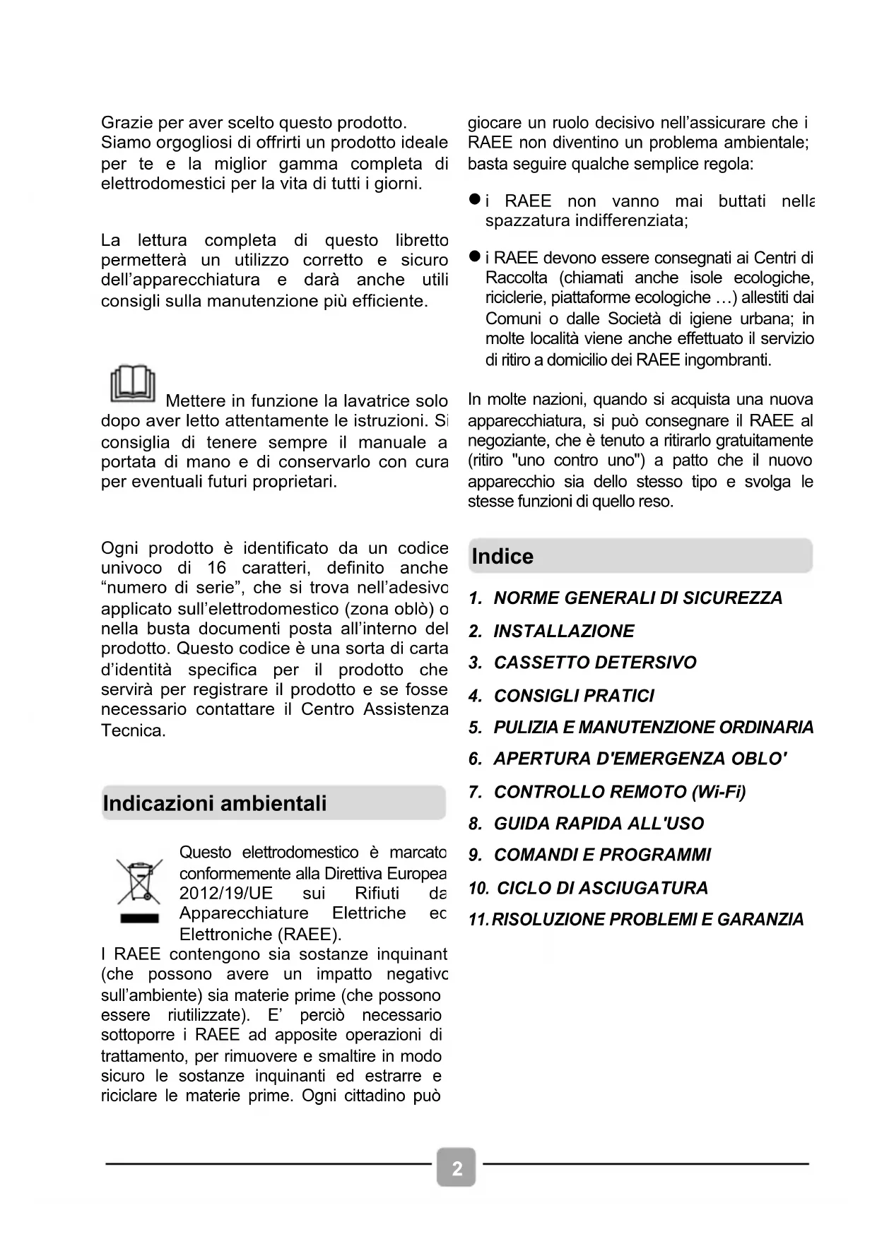 Mettere in funzione la lavatrice solo dopo aver letto attentamente le istruzioni. Si consiglia di tenere sempre il manuale a portata di mano e di conservarlo con cura per eventuali futuri proprietari.