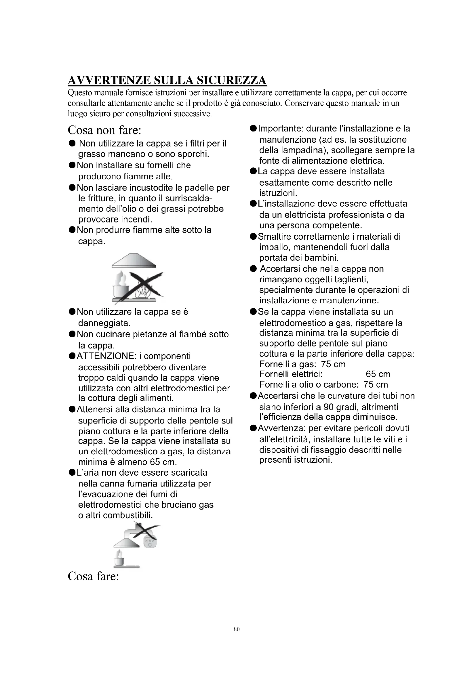Questo manuale fornisce istruzioni per installare e utilizzare correttamente la cappa, per cui occorre consultarle attentamente anche se il prodotto è già conosciuto. Conservare questo manuale in un luogo sicuro per consultazioni successive. Cosa non fare: ● Non utilizzare la cappa se i filtri per il grasso mancano o sono sporchi. ●Non installare su fornelli che producono fiamme alte. ●Non lasciare incustodite le padelle per le fritture, in quanto il surriscalda- mento dell’olio o dei grassi potrebbe provocare incendi. ●Non produrre fiamme alte sotto la cappa. ●Non utilizzare la cappa se è danneggiata. ●Non cucinare pietanze al flambé sotto la cappa. ●ATTENZIONE: i componenti accessibili potrebbero diventare troppo caldi quando la cappa viene utilizzata con altri elettrodomestici per la cottura degli alimenti. ●Attenersi alla distanza minima tra la superficie di supporto delle pentole sul piano cottura e la parte inferiore della cappa. Se la cappa viene installata su un elettrodomestico a gas, la distanza minima è almeno 65 cm. ●L’aria non deve essere scaricata nella canna fumaria utilizzata per l’evacuazione dei fumi di elettrodomestici che bruciano gas o altri combustibili. Cosa fare: ●Importante: durante l’installazione e la manutenzione (ad es. la sostituzione della lampadina), scollegare sempre la fonte di alimentazione elettrica. ●La cappa deve essere installata esattamente come descritto nelle istruzioni. ●L’installazione deve essere effettuata da un elettricista professionista o da una persona competente. ●Smaltire correttamente i materiali di imballo, mantenendoli fuori dalla portata dei bambini. ● Accertarsi che nella cappa non rimangano oggetti taglienti, specialmente durante le operazioni di installazione e manutenzione. ●Se la cappa viene installata su un elettrodomestico a gas, rispettare la distanza minima tra la superficie di supporto delle pentole sul piano cottura e la parte inferiore della cappa: Fornelli a gas: 75 cm Fornelli elettrici: 65 cm Fornelli a olio o carbone: 75 cm ●Accertarsi che le curvature dei tubi non siano inferiori a 90 gradi, altrimenti l’efficienza della cappa diminuisce. ●Avvertenza: per evitare pericoli dovuti all’elettricità, installare tutte le viti e i dispositivi di fissaggio descritti nelle presenti istruzioni. 80Cosa fare: ●Se il fornello è a gas, coprire sempre le pentole con i coperchi. ●In modalità estrazione, l’aria nell’ambiente viene rimossa dalla cappa. Predisporre un’adeguata ventilazione. La cappa elimina gli odori dall’ambiente, ma non il vapore. ●La cappa deve essere utilizzata solo in ambienti domestici. ●Se il cavo di alimentazione è danneggiato deve essere sostituito dal produttore, da un rappresentante o da una persona competente per evitare rischi. ●Questo elettrodomestico può essere utilizzato da bambini di almeno 8 anni, da persone con ridotte capacità fisiche, sensoriali o mentali e da persone inesperte solo se sono controllate o se hanno appreso le modalità di utilizzo sicuro dell’elettrodomestico e sono consapevoli dei relativi rischi. Impedire ai bambini di giocare con l’elettrodomestico. La pulizia e la manutenzione non devono essere effettuate dai bambini senza supervisione. ●Avvertenza: scollegare l’alimentazione elettrica prima di accedere ai terminali elettrici. Cosa fare: ●Attenzione: l’elettrodomestico e i componenti accessibili potrebbero diventare molto caldi durante l’uso. Non toccare le resistenze. Tenere lontani i bambini di età inferiore a 8 anni o sorvegliarli continuamente. ●Se la cappa viene utilizzata assieme a elettrodomestici che bruciano gas o altri combustibili, predisporre un’adeguata ventilazione dell’ambiente. ●Per evitare il rischio di incendi, eseguire le operazioni di pulizia come descritto nelle istruzioni. ●Attenersi scrupolosamente alle norme e ai regolamenti inerenti allo scarico dell’aria. ●Pulire periodicamente l’elettrodomestico con il metodo descritto nel capitolo MANUTENZIONE. ●Per motivi di sicurezza, utilizzare solo viti o dispositivi di montaggio delle dimensioni consigliate nel presente manuale di istruzioni. ●Per la frequenza e il metodo di pulizia, fare riferimento alle istruzioni dettagliate contenute nella sezione dedicata alla pulizia e alla manutenzione. ●La pulizia e la manutenzione non devono essere effettuate dai bambini senza supervisione. ●Se la cappa viene utilizzata contemporaneamente ad altri elettrodomestici alimentati con fonti alternative all’elettricità, la pressione negativa dell’ambiente non deve essere superiore a 4 Pa (4×10