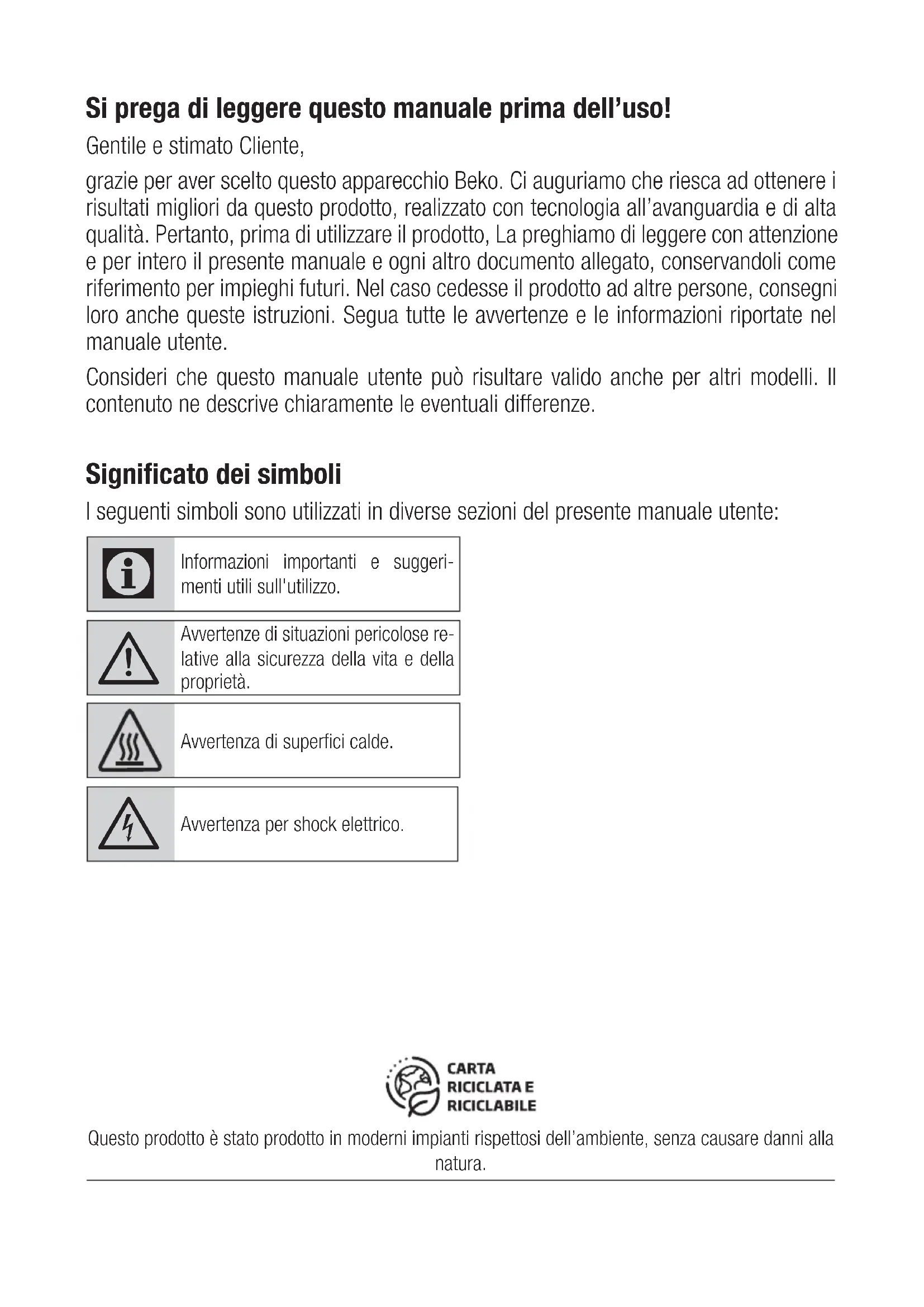 10. Tutti i materiali soggetti ad usura non sono coperti da garanzia a meno che venga dimostrata la difettosità risalente a vizio di fabbricazione delle stesse. 11. La BEKO Italy S.r.l. declina ogni responsabilità per eventuali danni che possano derivare, direttamente od indirettamente, a persone e cose come conseguenza del mancato rispetto delle istruzioni tutte, incluse nell’apposito Manuale per l’uso dell’ap- parecchio allegato a ciascuno apparecchio, da parte dell’utente ed in particolar modo per quanto concerne le avvertenze relative alla installazione, all’uso ed alla manutenzione dell’apparecchio stesso.