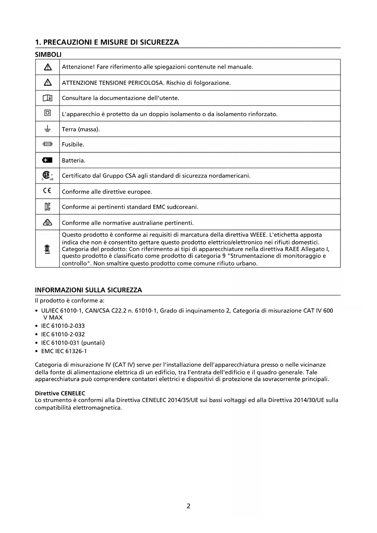 - EMC IEC 61326-1 Categoria di misurazione IV (CAT IV) serve per l'installazione dell'apparecchiatura presso o nelle vicinanze della fonte di alimentazione elettrica di un edificio, tra l'entrata dell'edificio e il quadro generale. Tale apparecchiatura può comprendere contatori elettrici e dispositivi di protezione da sovracorrente principali. Direttive CENELEC Lo strumento è conformi alla Direttiva CENELEC 2014/35/UE sui bassi voltaggi ed alla Direttiva 2014/30/UE sulla compatibilità elettromagnetica.3 Avvisi: Leggere prima dell’uso Per evitare la possibilità di scosse elettriche o lesioni: