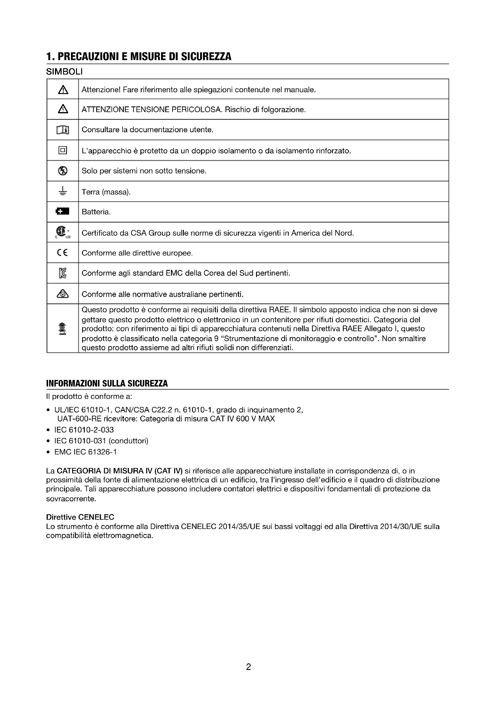 - EMC IEC 61326-1 La CATEGORIA DI MISURA lV (CAT IV) si riferisce alle apparecchiature installate in corrispondenza di, o in prossimità della fonte di alimentazione elettrica di un edificio, tra l'ingresso dell'edificio e il quadro di distribuzione principale. Tali apparecchiature possono includere contatori elettrici e dispositivi fondamentali di protezione da sovracorrente. Direttive CENELEC Lo strumento è conforme alla Direttiva CENELEC 2014/35/UE sui bassi voltaggi ed alla Direttiva 2014/30/UE sulla compatibilità elettromagnetica.3 Avvisi: Leggere prima dell’uso Per evitare eventuali folgorazioni o incidenti alla persona: