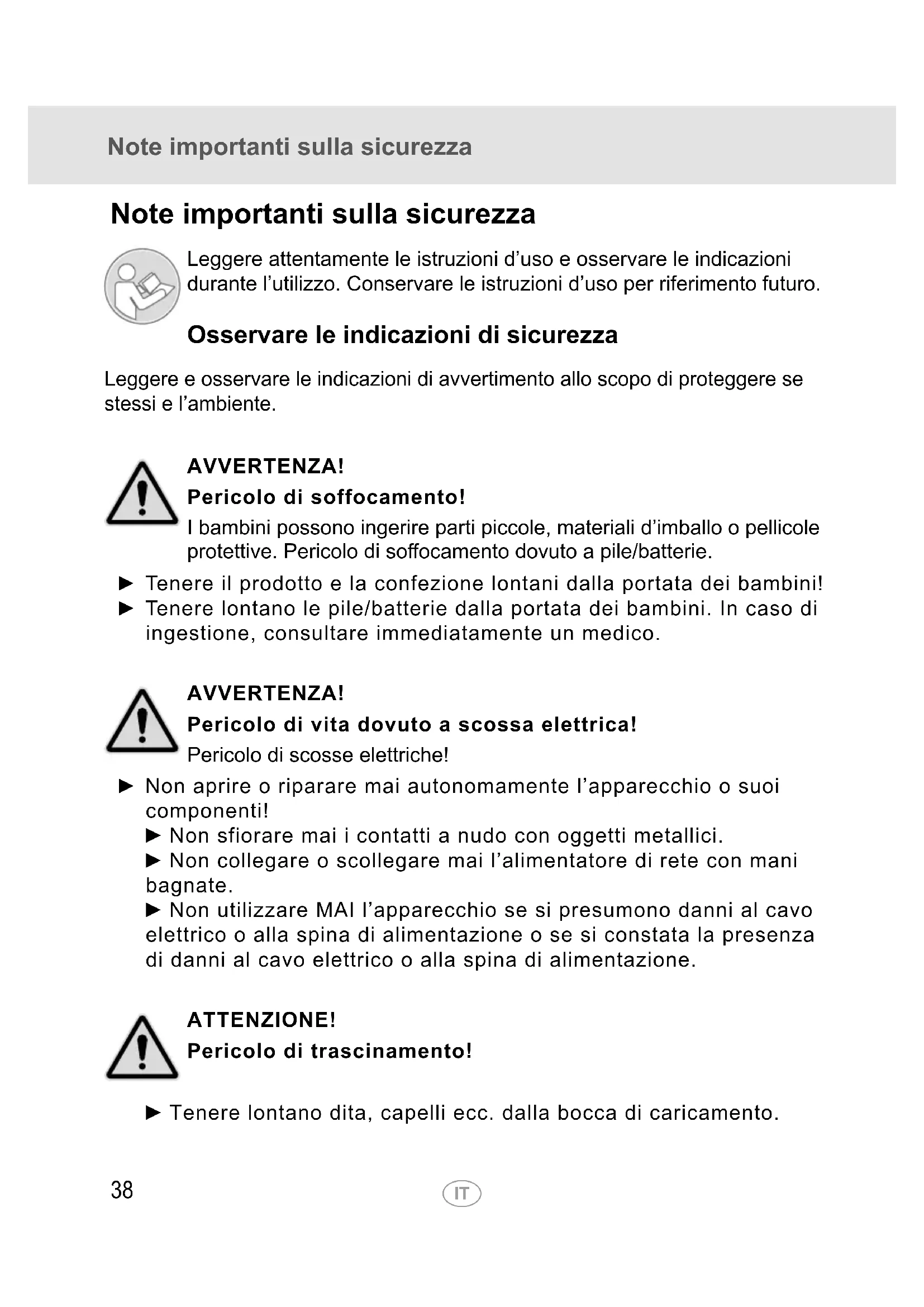 Note importanti sulla sicurezza Leggere attentamente le istruzioni d’uso e osservare le indicazioni durante l’utilizzo. Conservare le istruzioni d’uso per riferimento futuro. Osservare le indicazioni di sicurezza Leggere e osservare le indicazioni di avvertimento allo scopo di proteggere se stessi e l’ambiente. AVVERTENZA! Pericolo di soffocamento! I bambini possono ingerire parti piccole, materiali d’imballo o pellicole protettive. Pericolo di soocamento dovuto a pile/batterie. ► Tenere il prodotto e la confezione lontani dalla portata dei bambini! ► Tenere lontano le pile/batterie dalla portata dei bambini. In caso di ingestione, consultare immediatamente un medico. AVVERTENZA! Pericolo di vita dovuto a scossa elettrica! Pericolo di scosse elettriche! ► Non aprire o riparare mai autonomamente l’apparecchio o suoi componenti! ► Non sfiorare mai i contatti a nudo con oggetti metallici. ► Non collegare o scollegare mai l’alimentatore di rete con mani bagnate. ► Non utilizzare MAI l’apparecchio se si presumono danni al cavo elettrico o alla spina di alimentazione o se si constata la presenza di danni al cavo elettrico o alla spina di alimentazione. ATTENZIONE! Pericolo di trascinamento! ► Tenere lontano dita, capelli ecc. dalla bocca di caricamento.Note importanti sulla sicurezza