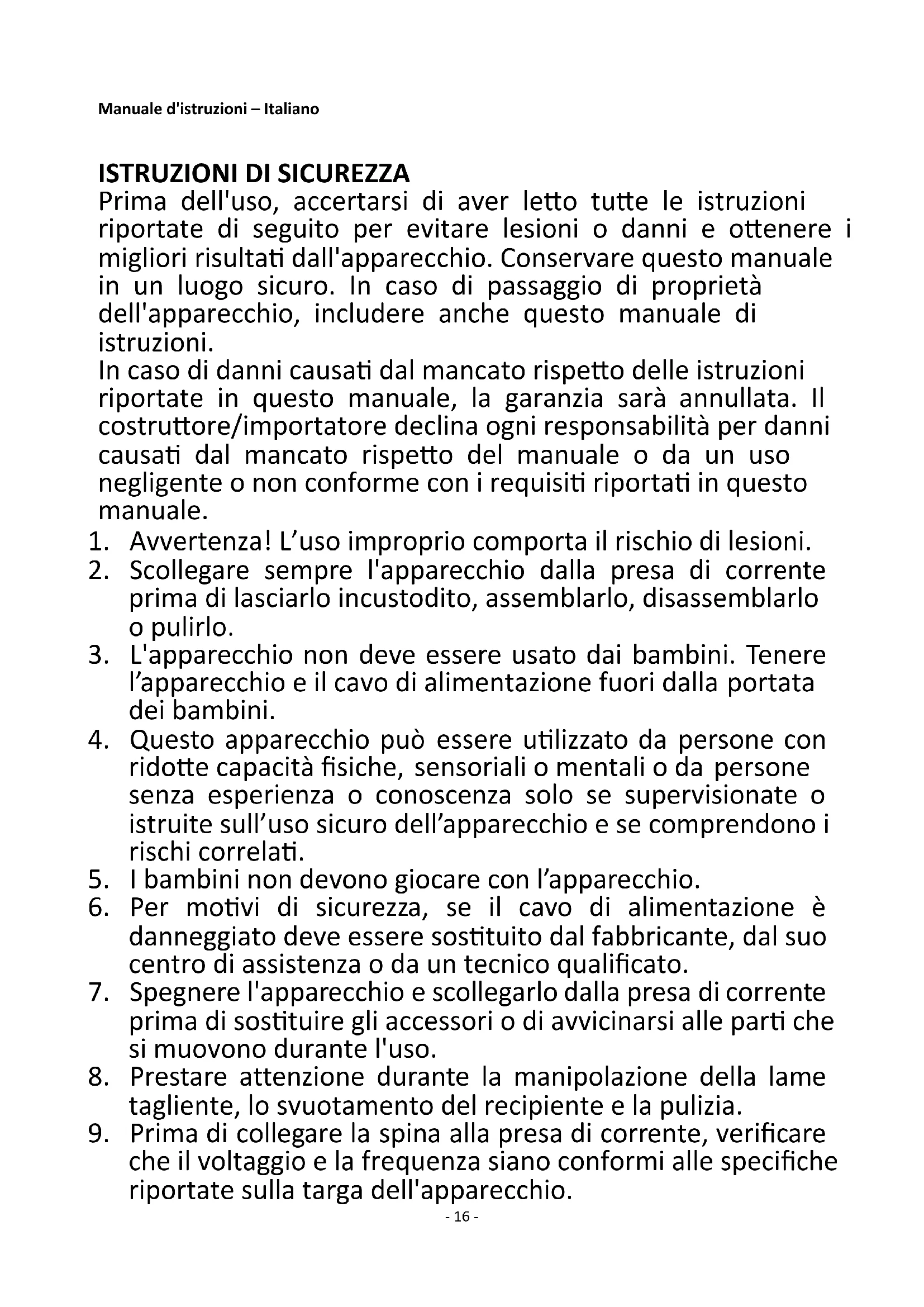 Prima dell'uso, accertarsi di aver letto tutte le istruzioni riportate di seguito per evitare lesioni o danni e ottenere i migliori risultati dall'apparecchio. Conservare questo manuale in un luogo sicuro. In caso di passaggio di proprietà dell'apparecchio, includere anche questo manuale di istruzioni. In caso di danni causati dal mancato rispetto delle istruzioni riportate in questo manuale, la garanzia sarà annullata. Il costruttore/importatore declina ogni responsabilità per danni causati dal mancato rispetto del manuale o da un uso negligente o non conforme con i requisiti riportati in questo manuale.