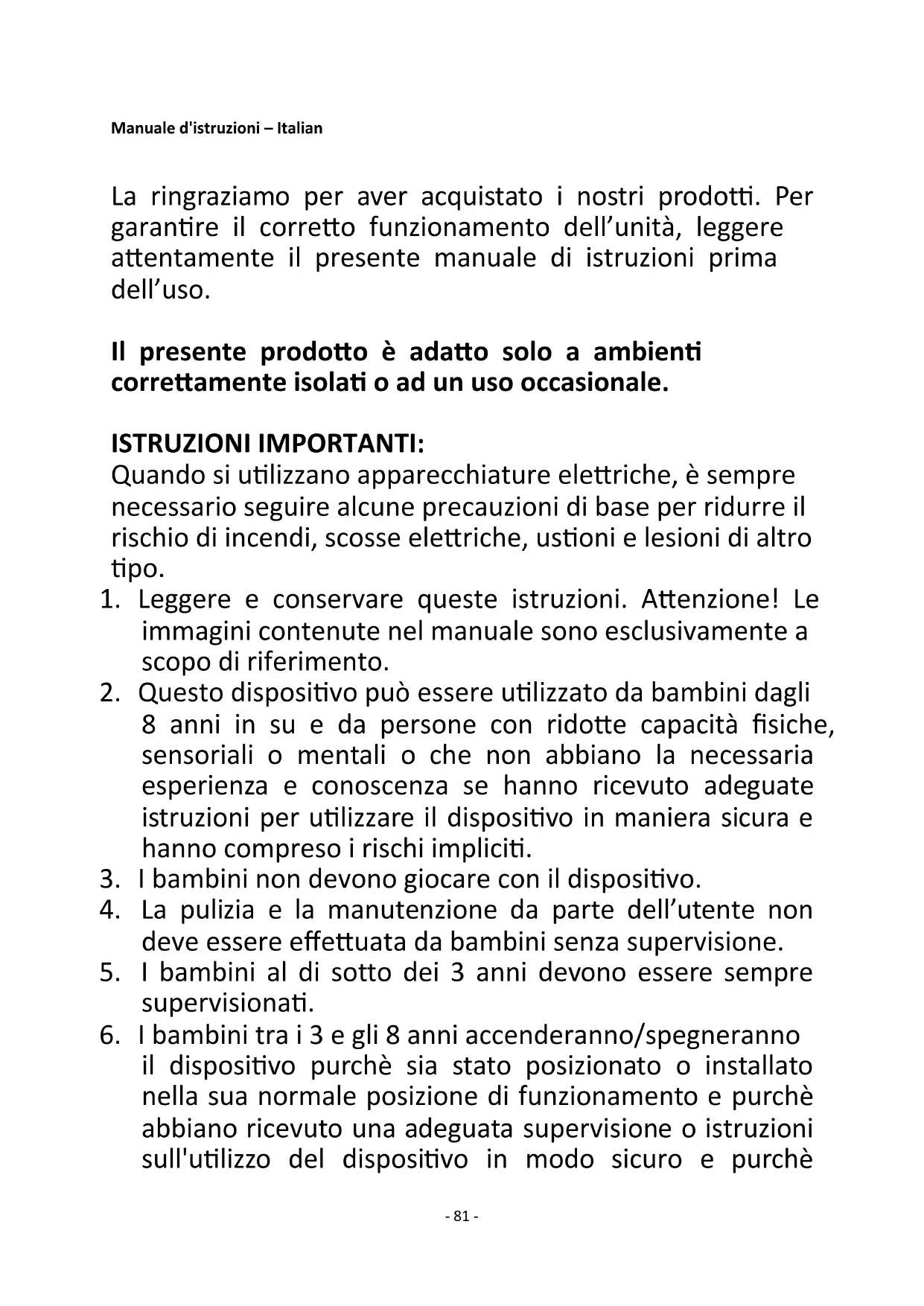il dispositivo purchè sia stato posizionato o installato nella sua normale posizione di funzionamento e purchè abbiano ricevuto una adeguata supervisione o istruzioni sull'utilizzo del dispositivo in modo sicuro e purchè- 82 - comprendano i rischi impliciti del suo utilizzo. I bambini dai 3 anni agli 8 non collegheranno, regoleranno nè svolgeranno operazioni di pulizia o manutenzione sullo stesso.