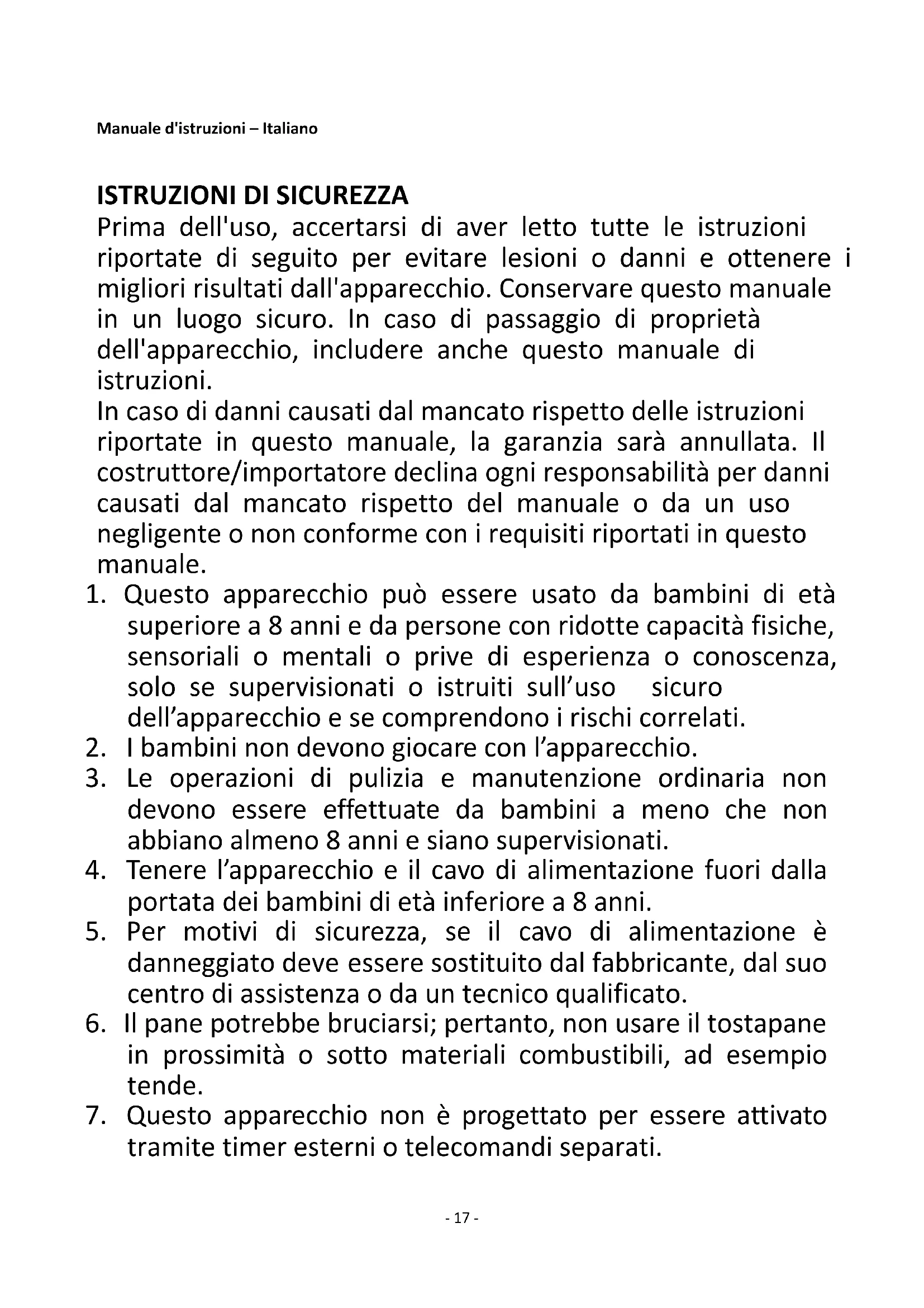 In caso di danni causati dal mancato rispetto delle istruzioni riportate in questo manuale, la garanzia sare è annullata. Il costruttore/importatore declina agli responsabilità per danni causati dal mancato rispetto del manuale o da un uso negligente o non conforme con i requisiti riportati in questo manuale.